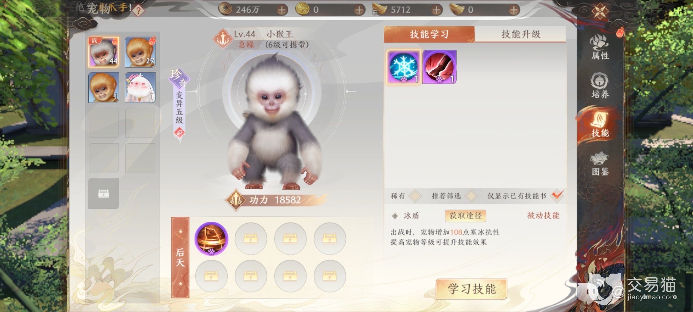 这里就不同的类型介绍一下有关的宠物,比如此处的外功型里面,大家完成新手任务之后便可以获取到小猴子,它的技能为减速。而想要获取的九尾狐就需要去往副本挑战里面,这个宠物是可以进行九级变异的,它的先天技能有减速和冰冻效果,契灵能力是可以在快要被击败的时候免疫所受的伤害,同时会冰冻对方和增加自己技能的伤害。
