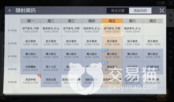在日常任务中还有一个限时活动的玩法,大家可以从活动日历里面看到这些活动具体的时间,就像是油汽争夺平原,它只有在每个星期一、星期三以及星期五的早上10点到晚上23点开启,大家只有在这规定的时间里面才能尝试该玩法,篝火晚会以及突袭鹰潮等活动也是如此,大家得先参考一下活动日历,才能准确把握活动时间哦,若是错过该时间的话,就无法参与本次活动了,只能等待下一次的开启。