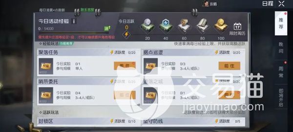 在日程里面有个叫做今日活动经验的玩法,在这个玩法里面主要分成了四个任务,都是可以帮助大家获得大量经验的活动,若是等级比较低的玩家,就可以来这里完成活动,刷取经验,帮助角色快速升级了,但是大家一定要看好活动的条件,比如聚落任务,它是需要单人参加活动才可以,而哨所委托则需要3到4个人进行组队游戏,总之参加什么活动之前,一定要看好它的参赛条件哦。