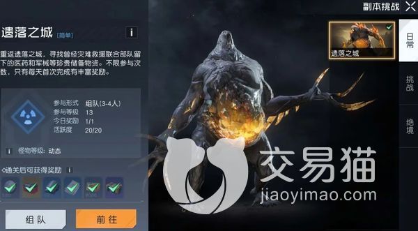 在日常任务中,还有一个最重要的玩法就是副本挑战了大家达到不同等级之后就能解锁不同的挑战,其中遗落之城这个挑战它只需要玩家达到13级,并且早上2到3个好友一起组队游戏,就可以参加本次挑战啦,挑战完成之后就可以获得大量的奖励,还可以直接获得20点活跃度。大家可以在副本挑战的日常活动中直接看到具体的内容,在这个关卡里的怪物它的难度处于动态,不过总的来说它强度并不高,是最适合新手玩家挑战的一个大boss,建议新手玩家一定要去试试看哦。