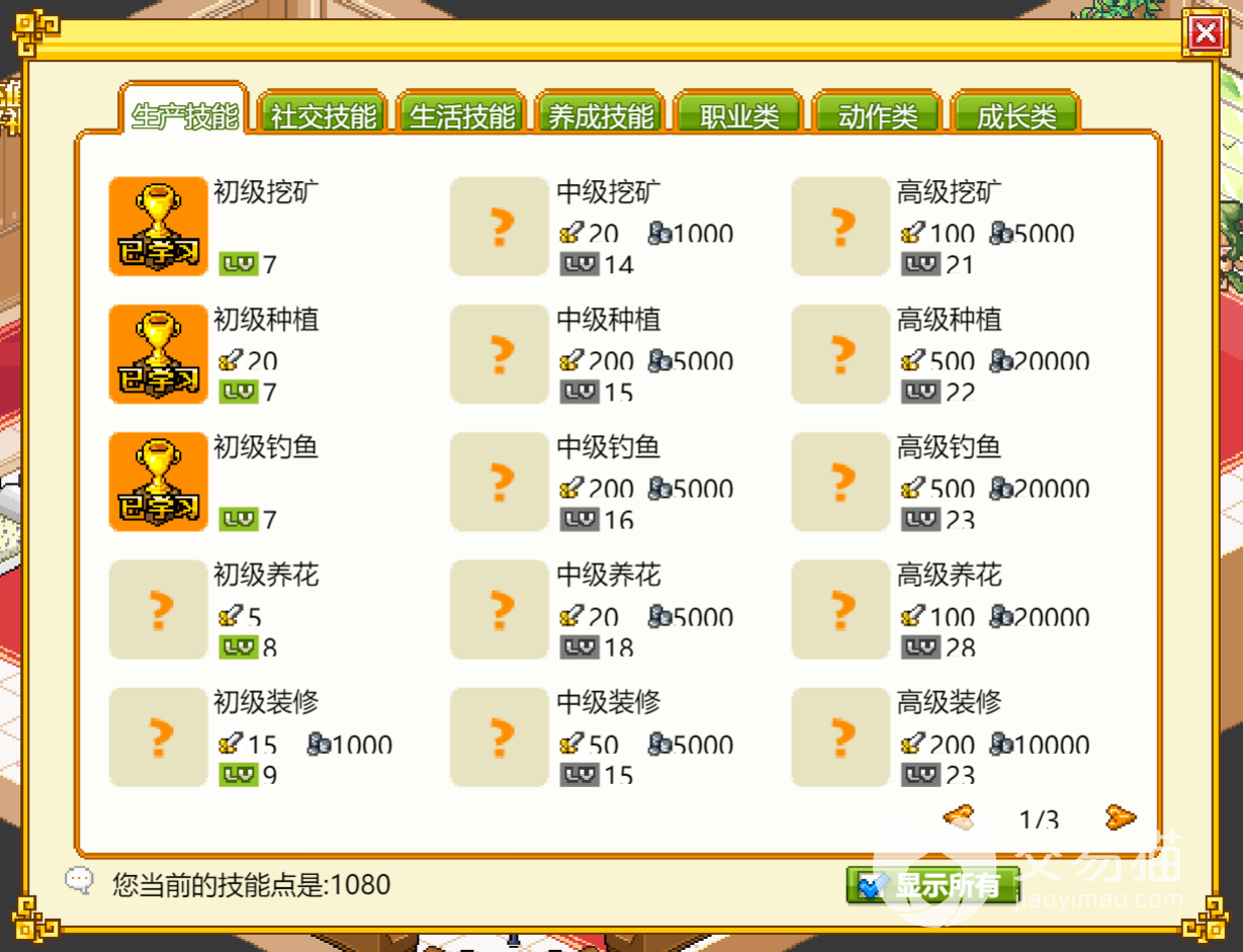 技能等级就是独立的等级系统,有挖矿技能还有种植技能,包括钓鱼技能等等,包罗了众多的生活技能,需要用钱和技能点学习才能升级技巧,技能点当然需要不断的使用,技能才能快速冲刺提升。