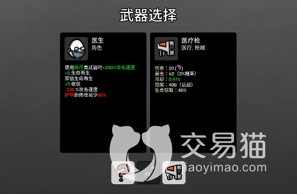 然后医生也是不错的选择,不过缺点就是和医疗武器绑定了,因为不使用这类武器的话它的攻速会变得很慢,不过如果使用了那么反而还能变成高攻速的存在了,而且它所增加的生命再生和收获作用也十分明显,配合医疗武器本身就附带的生命窃取,持续发展方面也是很强大的。