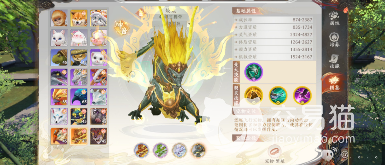 强力的远程飞行宠物,有着超强的内功输出范围伤害以及强力的控制能力,让它在任何情况下都可以造成极大的伤害和发挥作用。只能说神兽不愧是神兽宠物,其实力表现可见一斑。技能方面可以持续性的造成大范围伤aoe,并附带眩晕效果,龙威可以概率性的增加,上述的伤害范围最多能五倍。而且其他技能都是叠伤害以及一个保证伤害输出,是输出类型的顶尖级别。