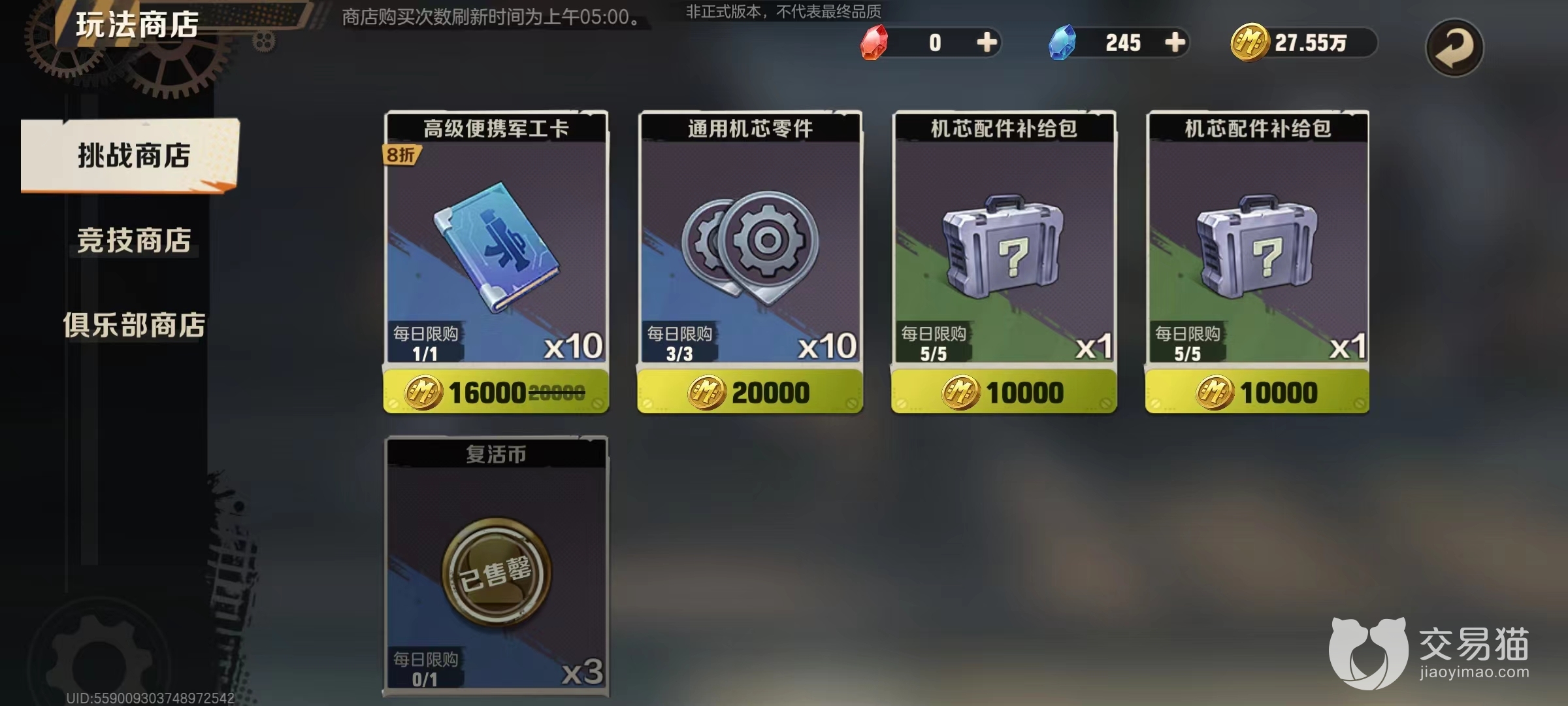 在合金弹头觉醒游戏中,有挑战商店、竞技商店、俱乐部商店这三个,其中挑战商店和俱乐部商店都有军工卡购买,挑战商店交易的货币是金币,每天可以买10张高级军工卡。而俱乐部商店交易的货币是俱乐部点券,每周限购5张高级军工卡。