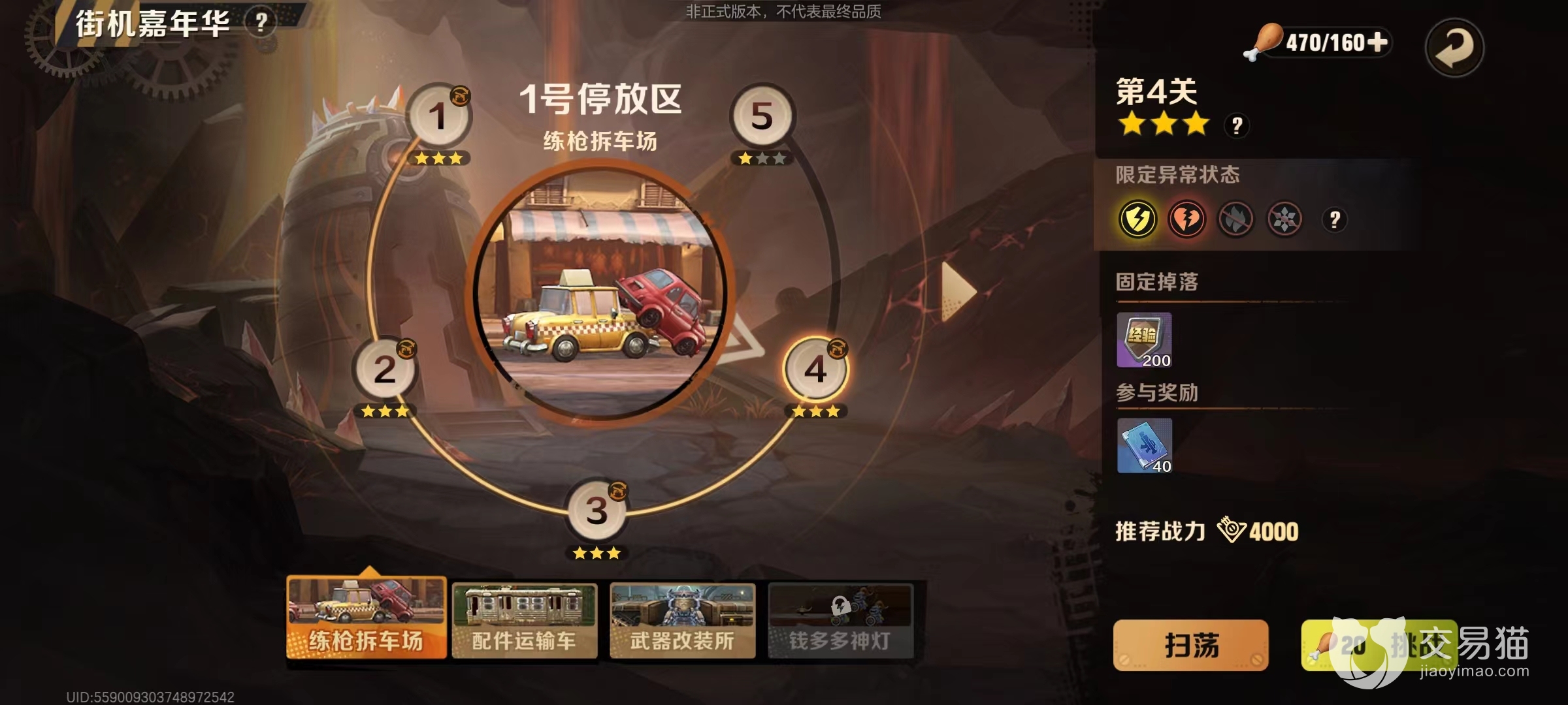 练车拆车场就街机嘉年华其中的一个玩法,有多个关卡可以挑战,每次挑战需要20点体力,3星通关后就可以解锁扫荡功能。扫荡可以直接选择战斗的次数,然后就能获得军工卡奖励了。
