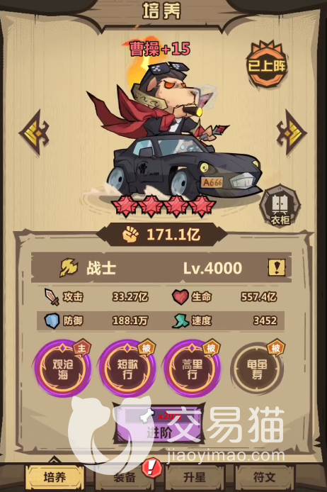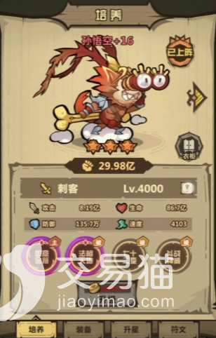 之后是两个副c孙悟空和荆轲,前者是一个月卡角色,想要养成他需要月卡支撑,他拥有四个被动,他也是唯一一个没有主动的角色,首先是他的第一个被动,这是一个保护性的被动,在实战中他受到致命伤的时候就会触发,出啊发之后就能抵挡这次伤害并且提升自生的攻击,他的第二个被动可以提高攻击次数最高为十次,第三个被动则能会在攻击三次之后释放一次重攻击,最后一个被动可以对生命值30之下的敌人造成额外百分之50的伤害,这套组合技让它光平a就能打出高额伤害,后者的配置为一主动三被动,主动效果可以提升暴击率并且随机对一位敌人造成百分之五百的伤害,他的三个被动则是基于主动的基础伤为他添加增伤buff,让他有更好的斩杀能力,在战斗中可以点名击杀残血敌人,收割能力非常的强。