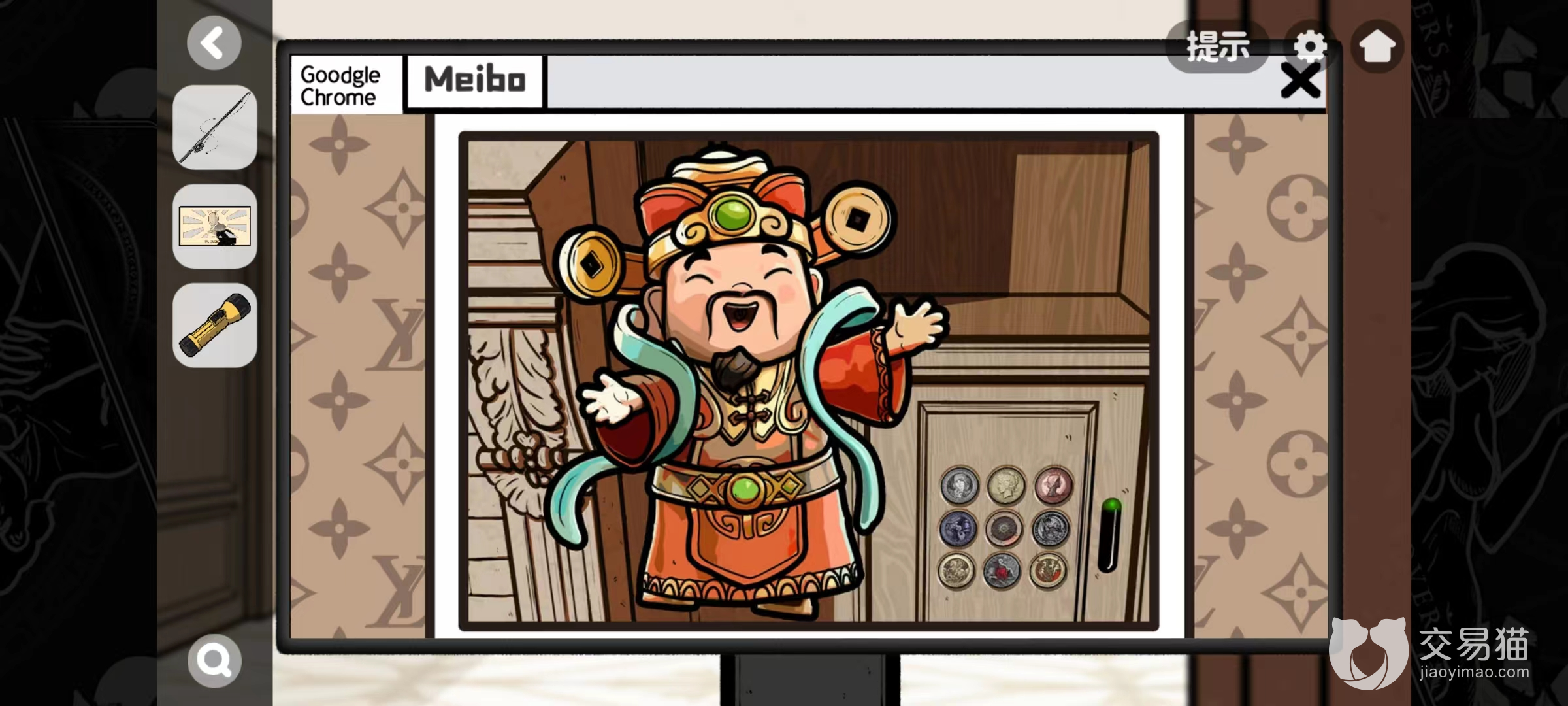 8、接下来回到电脑处插入【网卡】并搜索【Meibo】,点获取短信验证码后回到桌子下面摇晃手机解锁获得验证码【5462】,打开电脑浏览后可看到一个【财神爷的照片】记住他旁边的图案;再返回桌面搜索E-mail登陆再点【找回密码】;密保的生日信息需要用【螺丝刀】打开矮柜上面的照片获得信息年份日期【1998.4.1】,手机号码在【名片】和手机短信后四位【1823979020】,女团是【几何少女小圆】;