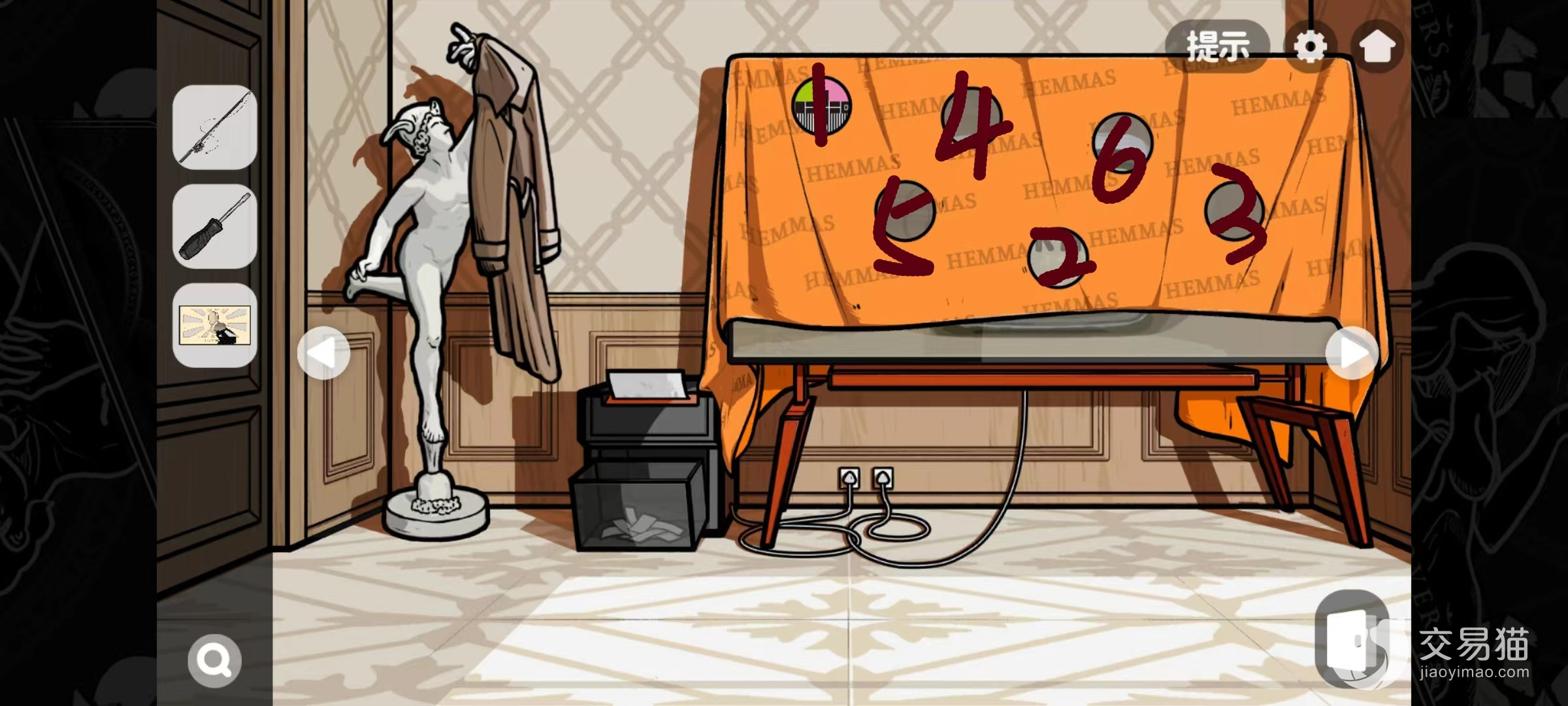 6、左边转入大电视中给电视盖上【幕布】再使用【遥控器】可以发现圆点在有序的动,记住顺序如图再回到右边解开左下的柜子获得【电源线】;