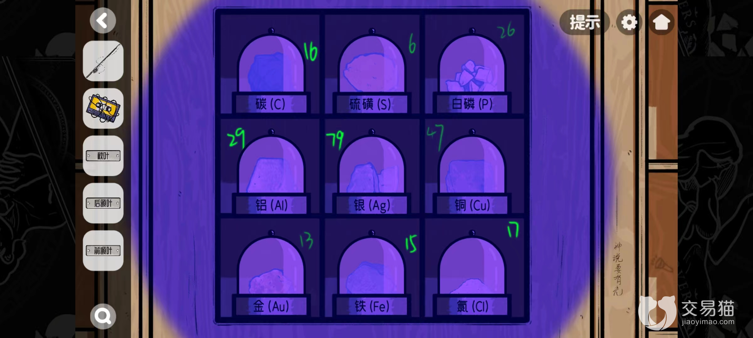 12、点击柜子中间的罐子,我们使用【手电筒】发现罐子后面有数字,我们需要对应元素周期表的上元素的数字排到柜子的数字处,即可打开后面的秘密的电梯,进入电梯将【电梯按钮】安装到电梯按钮空白处,即可通关。