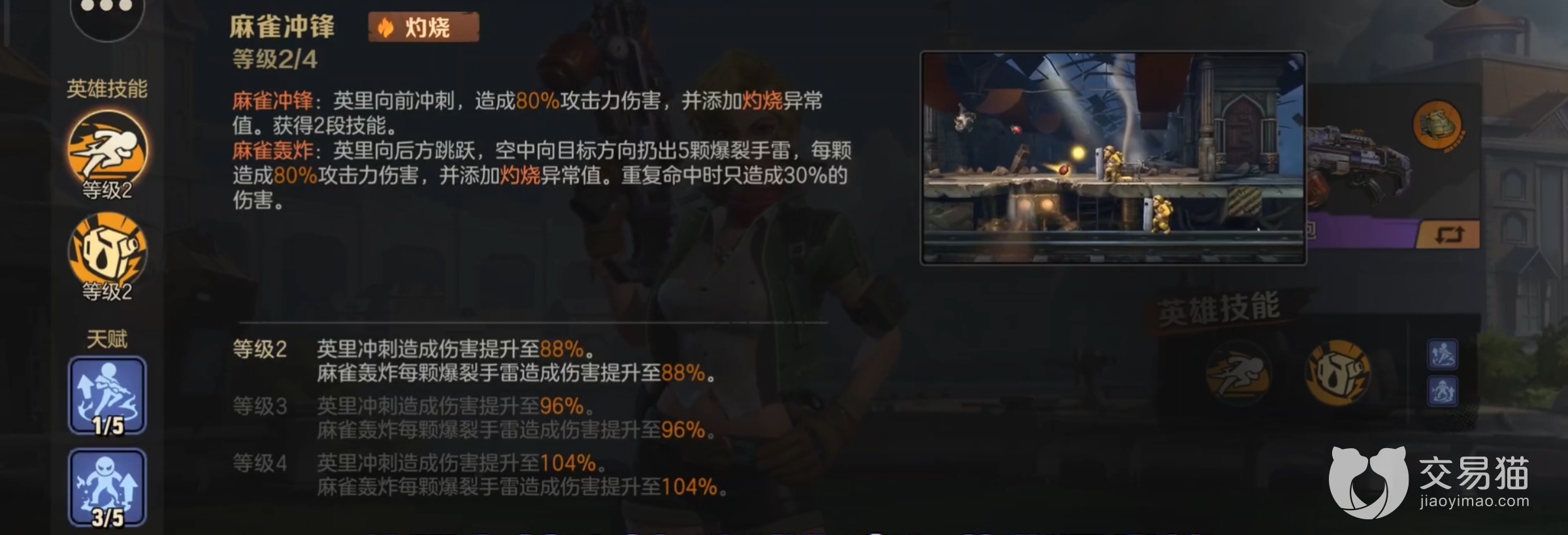 游戏里的笠本英里有两个技能,一技能是小招,叫做【麻雀冲锋】,该技能是二段技能,首先笠本会向前进行冲刺,对敌人造成80%攻击力伤害,并给他们增添上灼烧异常值。这时候就会获得二段技能,二段技能是名为【麻雀轰炸】,笠本会朝着后方做出跳跃的动作,进而从空中向目标方向投掷出5颗爆裂手雷,每颗手雷可以造成80%攻击力伤害,同时,给敌方目标添加灼烧异常值,如果重复命中一个目标的话,那么造成的伤害就只有30%了。