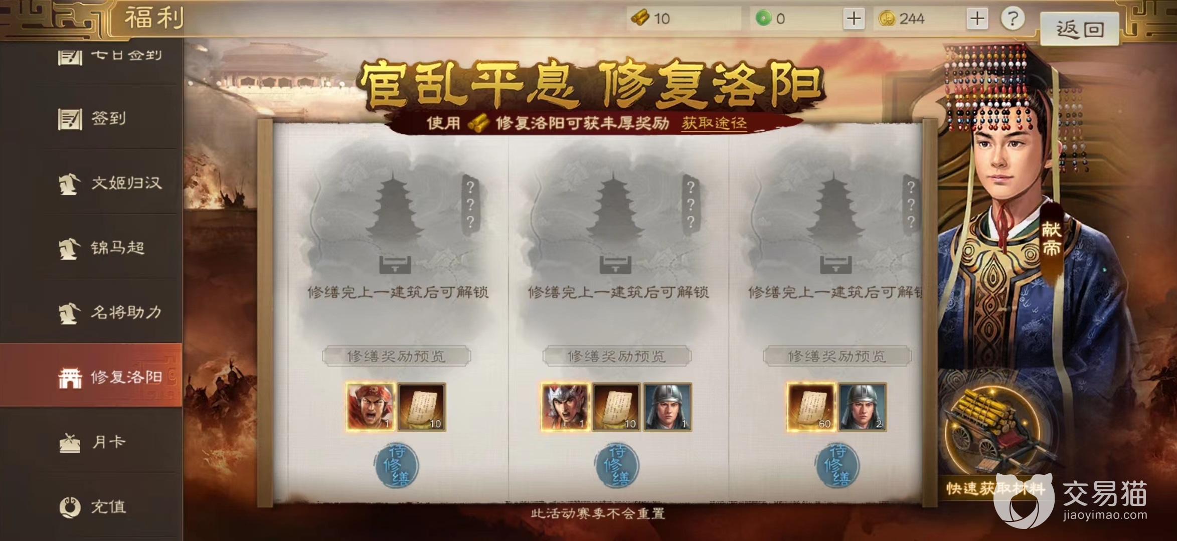 对于平民玩家来说,最关键的就是如何能获取到足够多的武将组成阵容,这一点就需要从系统所开放的免费活动入手。在开服7天之内每天保持登录,就可以获得两个橙色武将,分别是肉盾型曹仁和远程输出黄忠,这两人在橙将中并不属于强势类型,但是免费赠送之后前期开荒就有了着落。然后是要积极参加修复洛阳活动,在本个赛季都有效,里面赠送的都是核心选择,例如太史慈,关羽等,将这些获取之后就有了发展基础。
