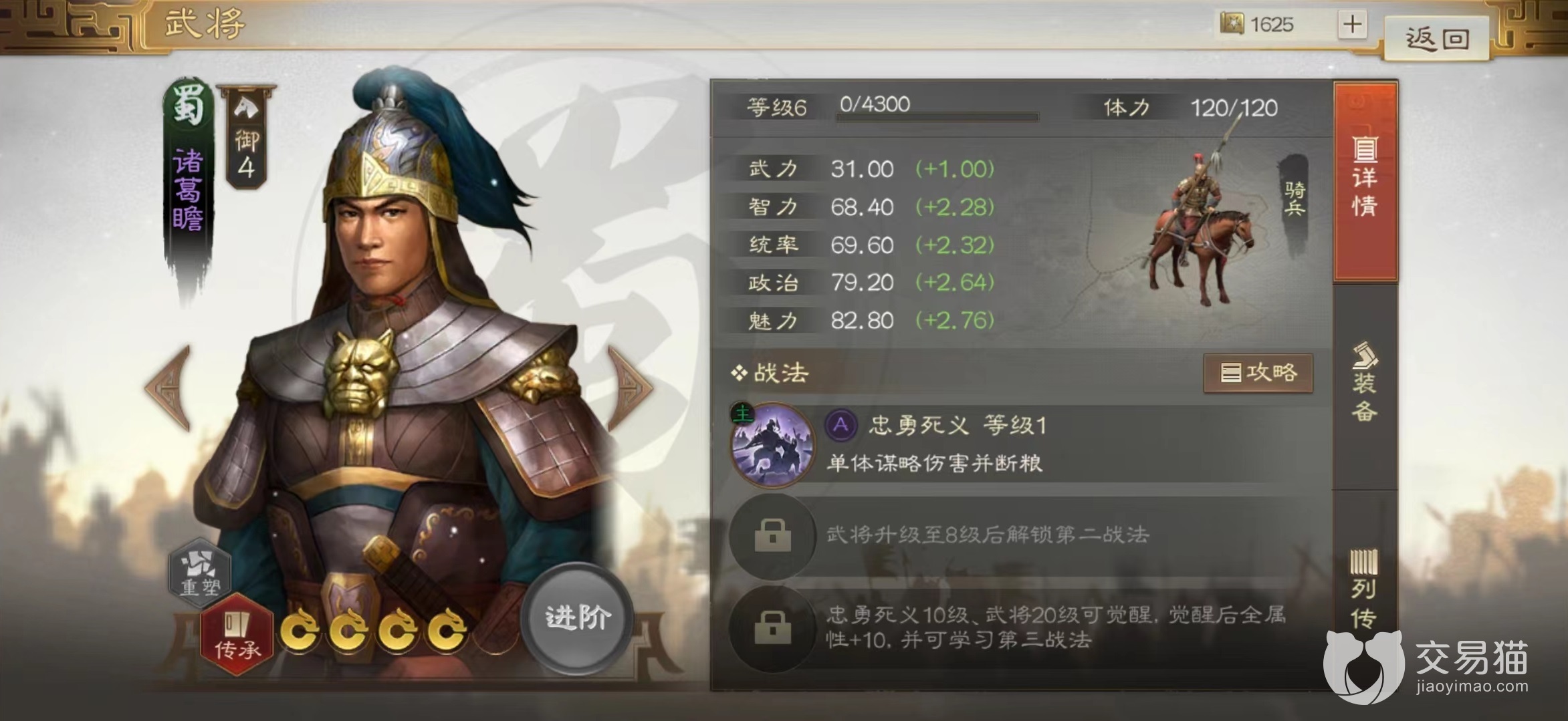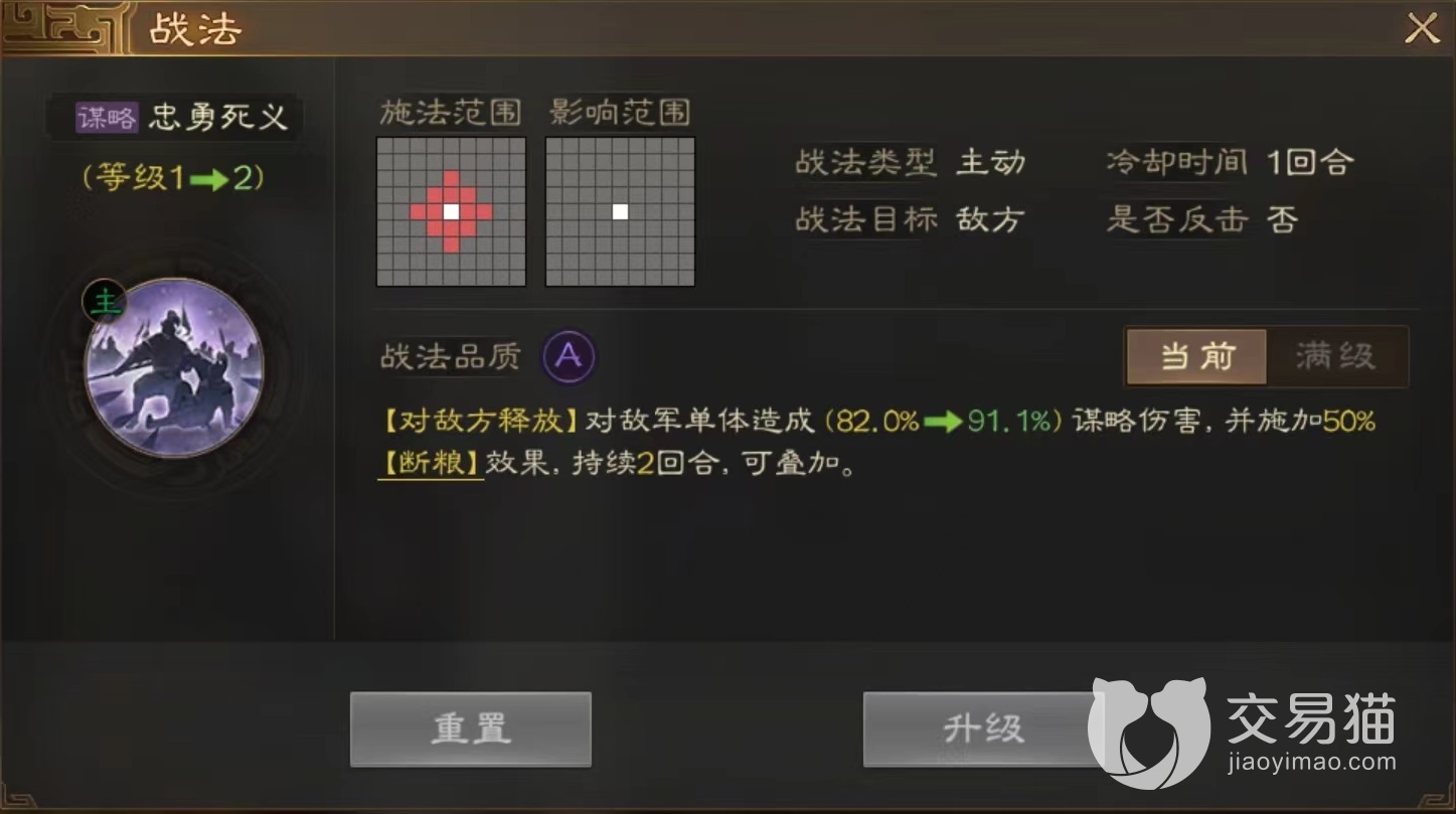 很多玩家对该战法比较陌生,因为它的来源诸葛瞻并不是很出名的角色,仅仅是蜀国阵营中一名紫色武将,而且属性比较差,绝大多数都是作为材料被分解掉。如果以诸葛瞻为主要传承对象,那么就能获得忠勇死义这项战法,人物虽然不突出,但是技能效果却很好。属于主动释放类技能,选中敌方单体后对其造成谋略伤害,并且附加断粮效果。当达到满级时伤害比例也能有164%,施加断粮效果为50%,持续两个回合,可以往上叠加,也可以和其他战法附加的相同效果叠加起来。