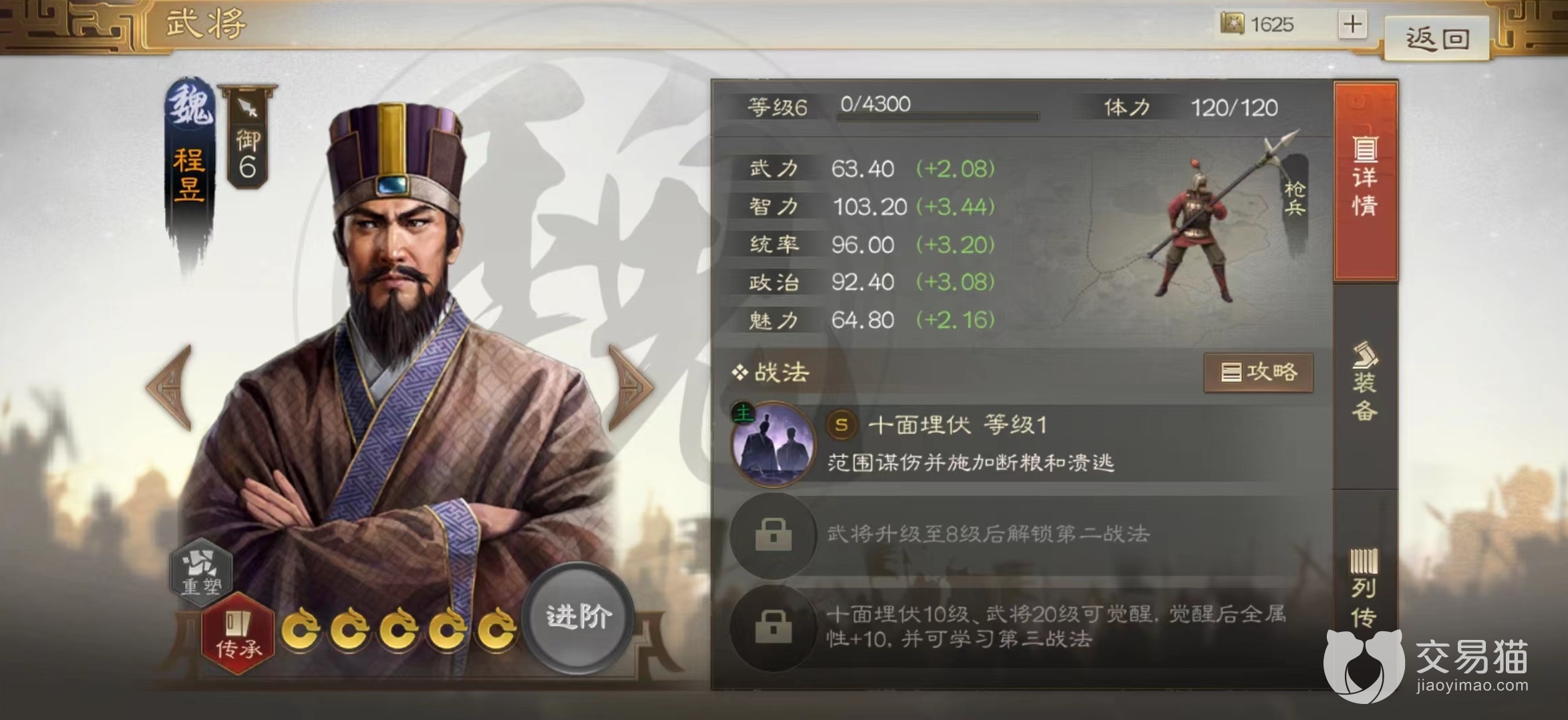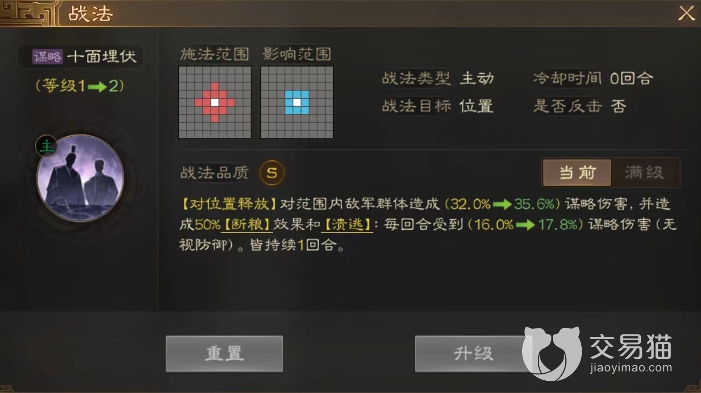 在搭配上也就很清楚,如果是选择其他战法,那么自然是同样能够附加断粮的技能,这样叠加到比较高比例才能真正限制,不然仅有50%根本达不到最佳效果。而且鉴于伤害类型,依然是谋略型使用更加妥当。小编非常推荐给程昱装备上,程昱作为魏国中的橙将,但是自身一直难以进入核心。战法十面埋伏可以造成谋略输出,同时附加断粮和溃逃这两个状态,现在又有了断粮技能,就可以自己叠加起来,重要性逐步上升。