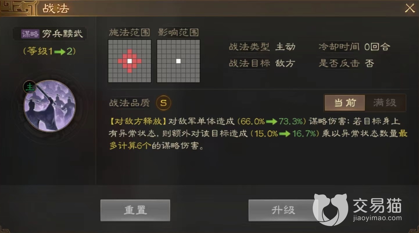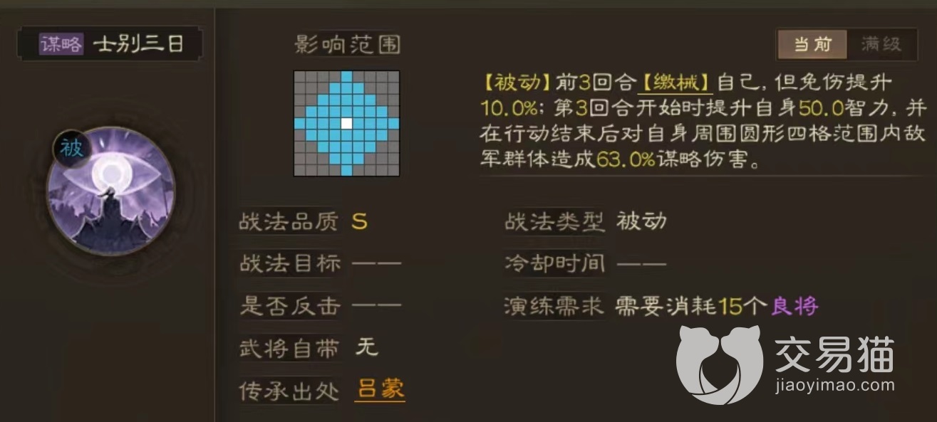 另外士别三日属于被动类型,在前三个回合自身进入缴械状态,但对于该角色来说没有太大影响,还能提高免伤防止被集火输出。第3个回合开始之后立即得到大量智力提升,接下来行动结束后可以造成大范围输出。这对于拥有高智力成长角色来说非常关键,整个搭配下来就能成为输出核心。如果前期没有太多橙色技能,那么选择紫色四方离乱、恃强凌弱等也是可以的,都能附加状态。