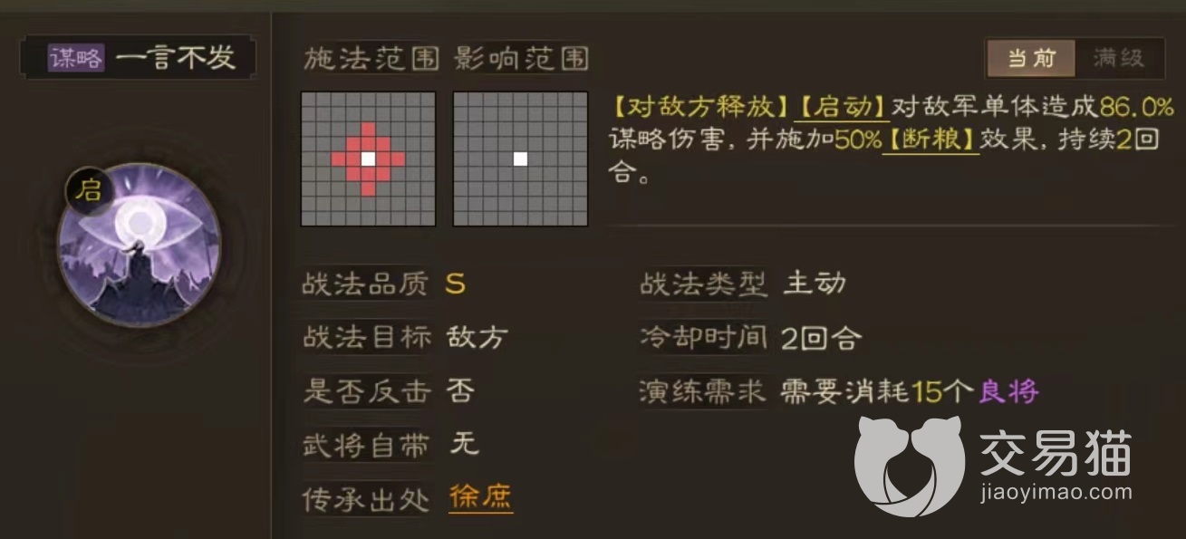 因为今天介绍的是技能搭配,所以没有考虑到其他队友所施加各种状态,如果要想自身完成整个循环,一定要拥有类似状态类技能。小编推荐最合适的为一言不发和士别三日。一言不发属于主动类,施法之后伤害敌方单体目标,最关键是能添加断粮效果,断粮也相当于异常状态,而且能防止对方恢复兵力,搭配上极其妥当,这样自己就有了叠加起来的机会。