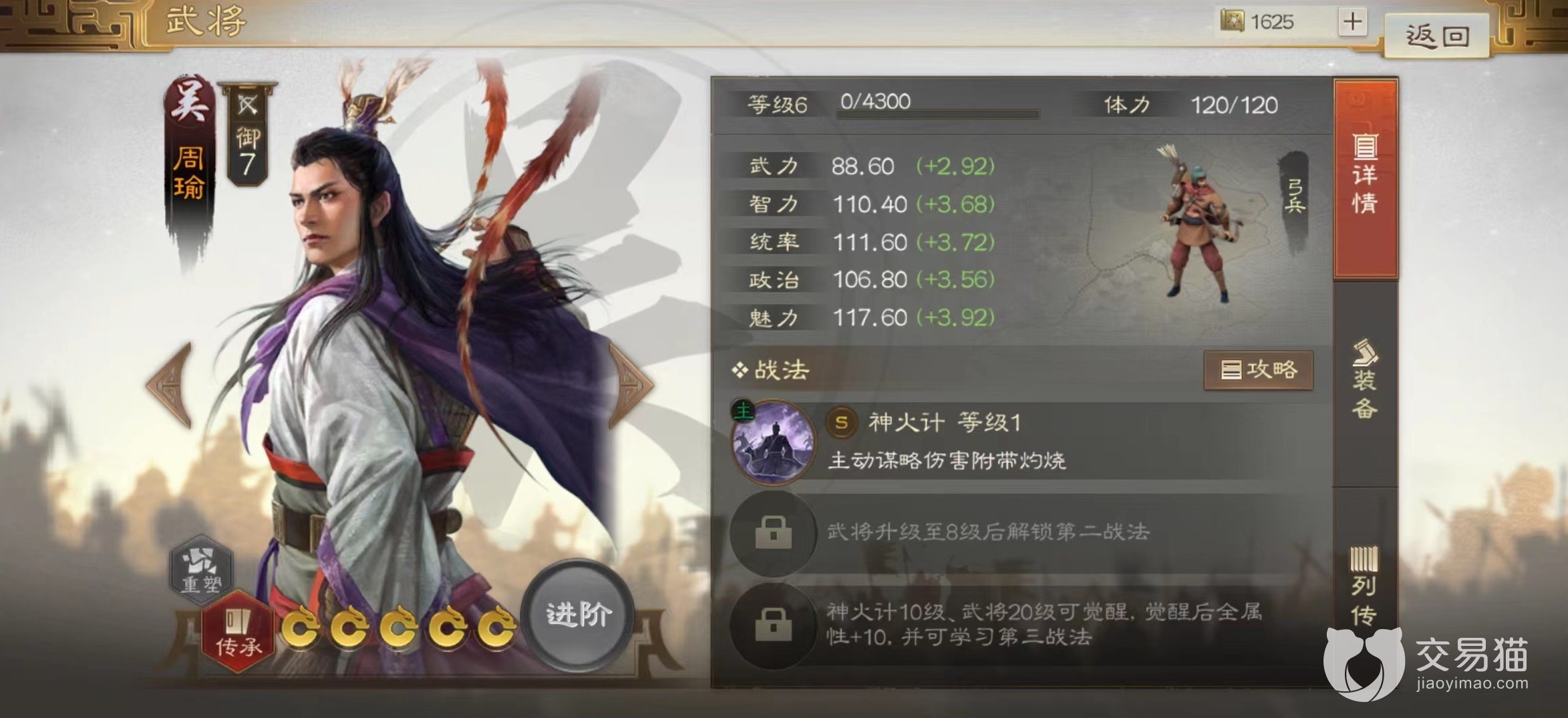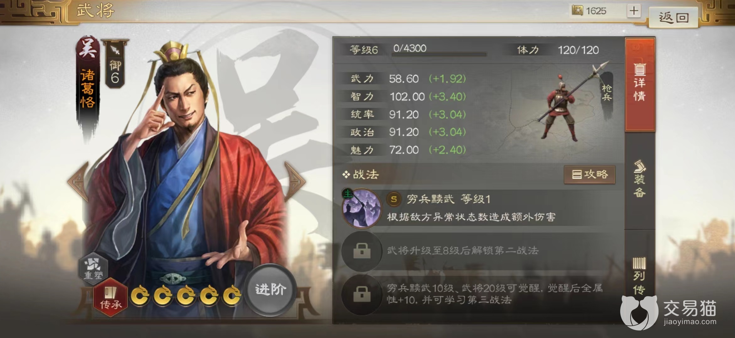 首先这是名智力型角色,虽然在相关属性成长上比诸葛亮要低些,但是也已经达到了一流水准,所以在基础属性方面完全不用担心。再加上自身属于枪兵,造成伤害本身就有加成,当然适合走输出路线。战法穷兵黩武是个效果非常独特的技能,在选中目标之后会先进行判定,根据对方身上带有多少个异常状态来确定最终伤害总量。