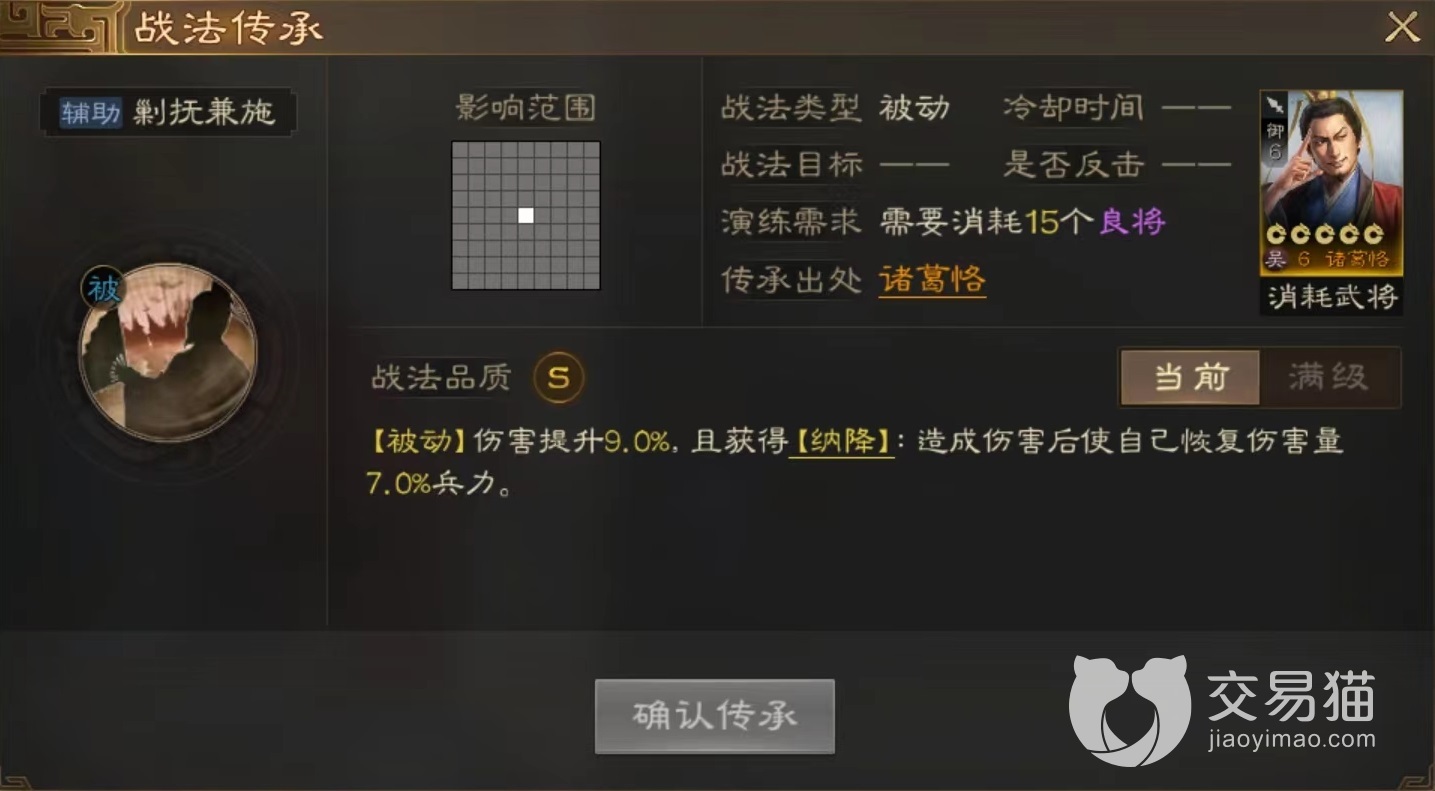 最后如果感觉该武将难以融入到自己阵容中,也可以选择将其分解掉获得橙色技能剿抚兼施。这是一个被动效果技能,可以让携带者造成伤害提升,同时获得纳降状态,纳降就相当于吸血,根据造成伤害总量恢复兵力,无论是武力还是谋略型将领都很合适,相当于拥有了续航能力,这样也能为整体作出贡献。