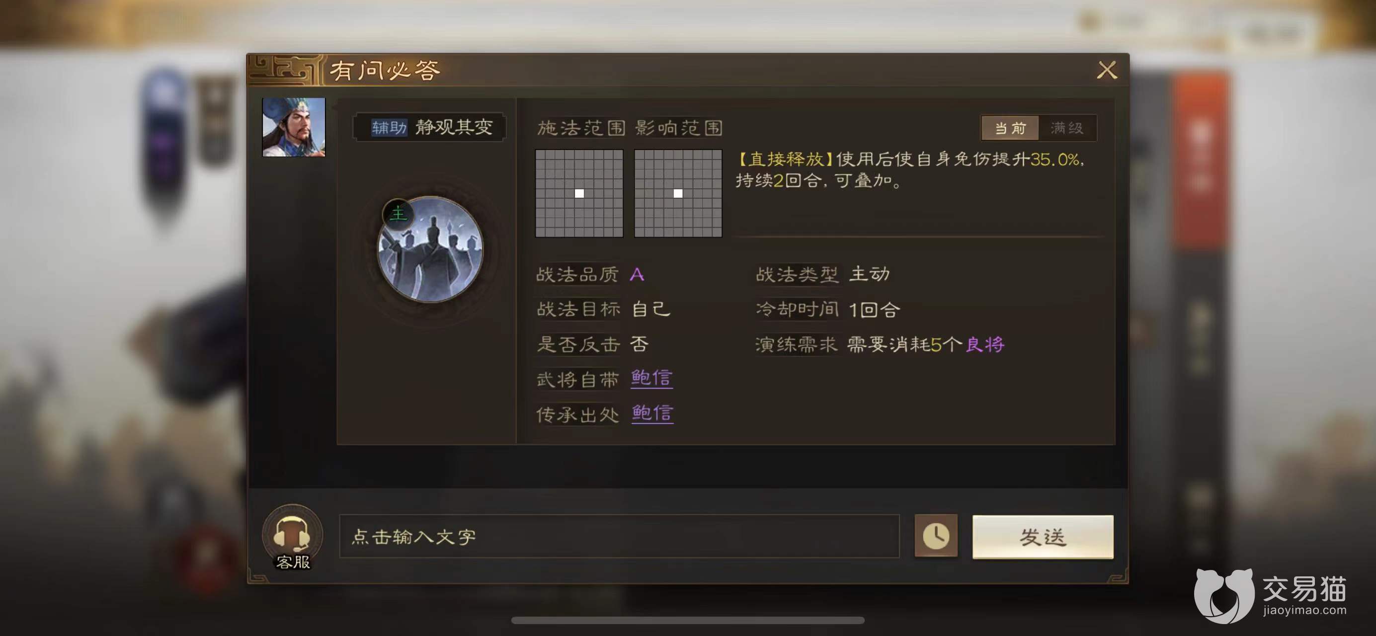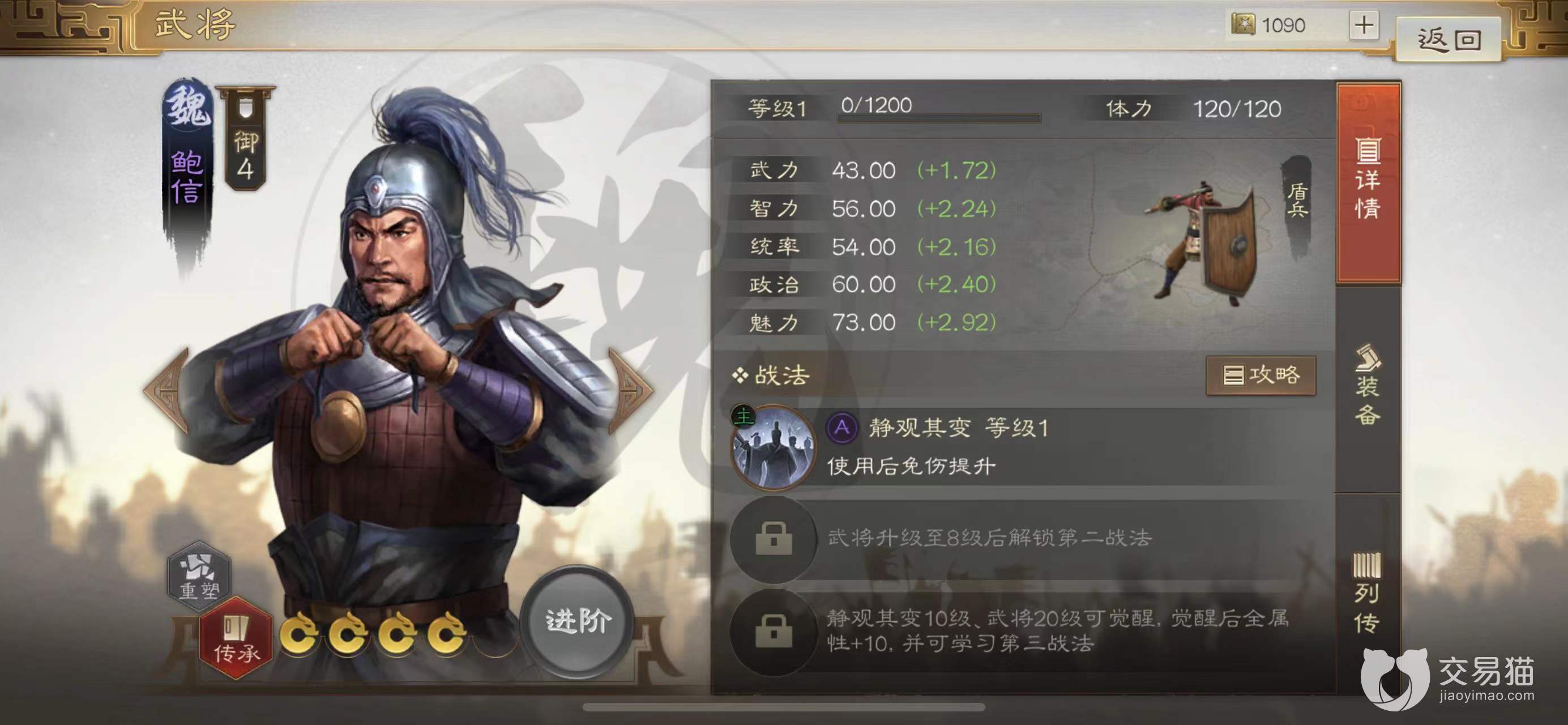首先因为想要获得全新的战法的话,就得获取相关武将并将其作为消耗品使用才能学习。这个战法来自于魏国的鲍信,他的名字就跟他的本人一样粗犷,有着很刚硬的脸庞,他所统领的是盾兵。所以防御上面还是很出色的,由于是一张紫卡,所以不难获得,大家可以用它去分解获得静观其变技能。