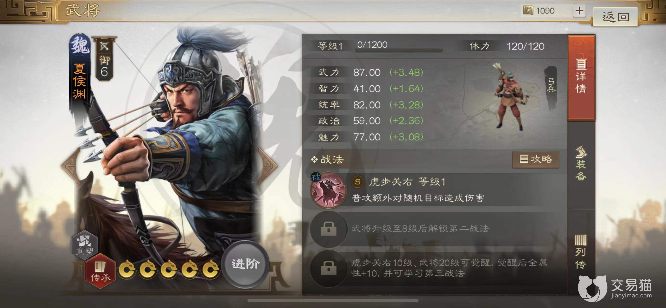 这个技能其实适合给输出类型的武将去使用,这里建议给夏侯渊。因为他虽然有着高额的兵刃伤害,但是自身防御值也相当低,为了避免他被人秒杀,所以可以用该战法去躲避输出。