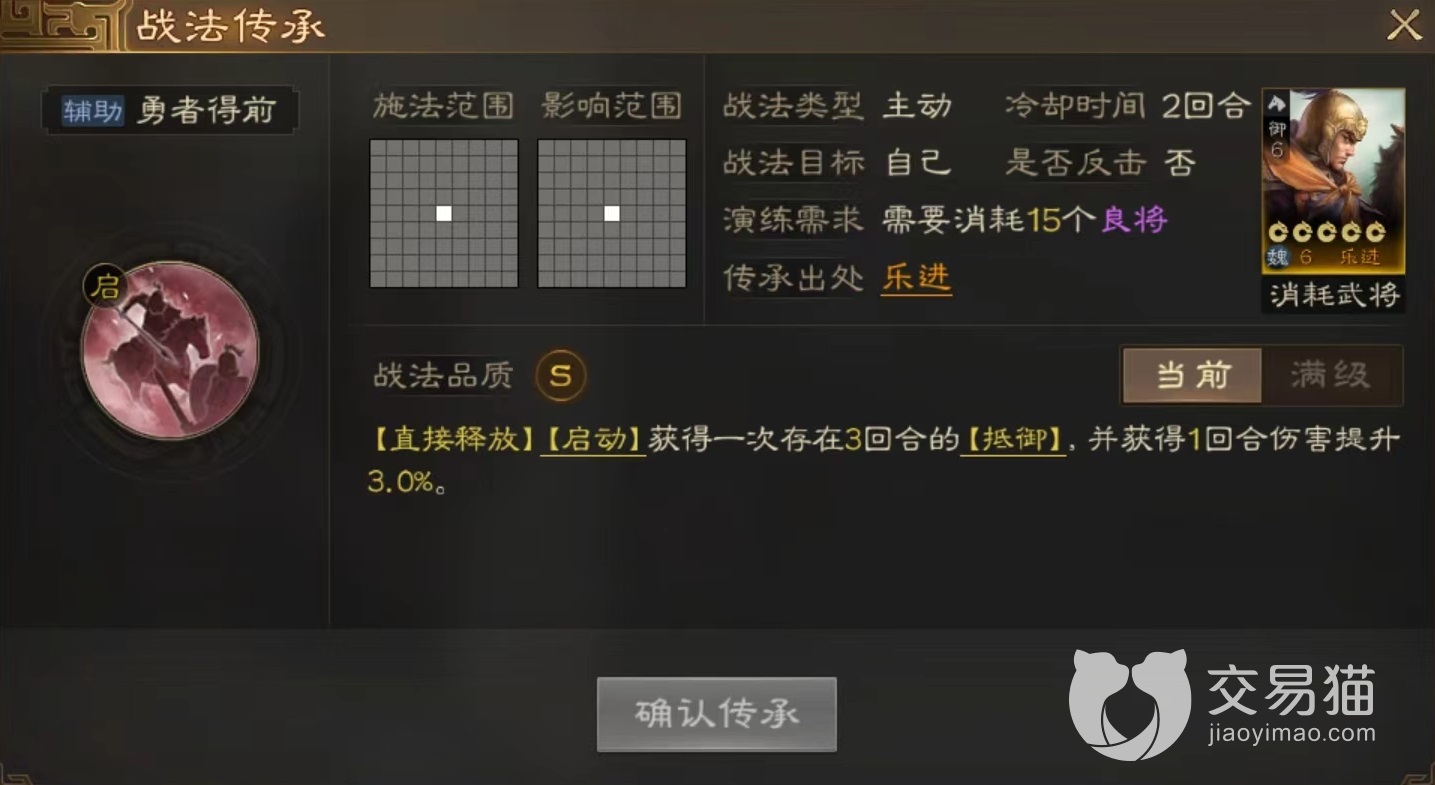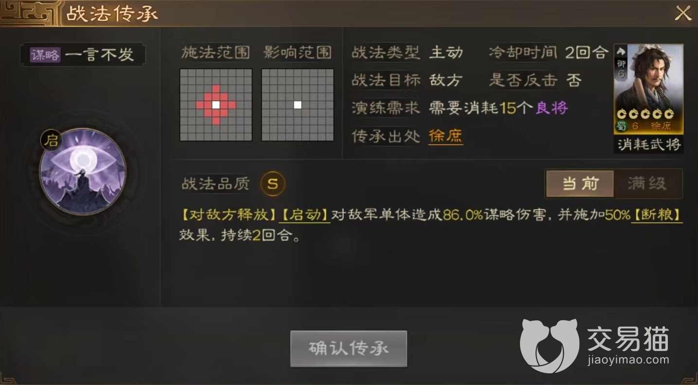 勇者得前由乐进分解后获取,效果是直接获得抵御状态,在此状态下可以抵挡一次受到的任意伤害。包括武力、谋略和对方带来反击等,全部计算在内,如果本回合内没有抵挡,最多存在三个回合。在施展之后的一回合内还能获得伤害提升,满级时为30%,这点才是最关键地方。一言不发来自徐庶,对敌方释放后除了有伤害之外,还会为其附加上断粮状态。断粮影响对方兵力恢复效果,无论是自己吸血还是治疗武将添加,都会克制住。
