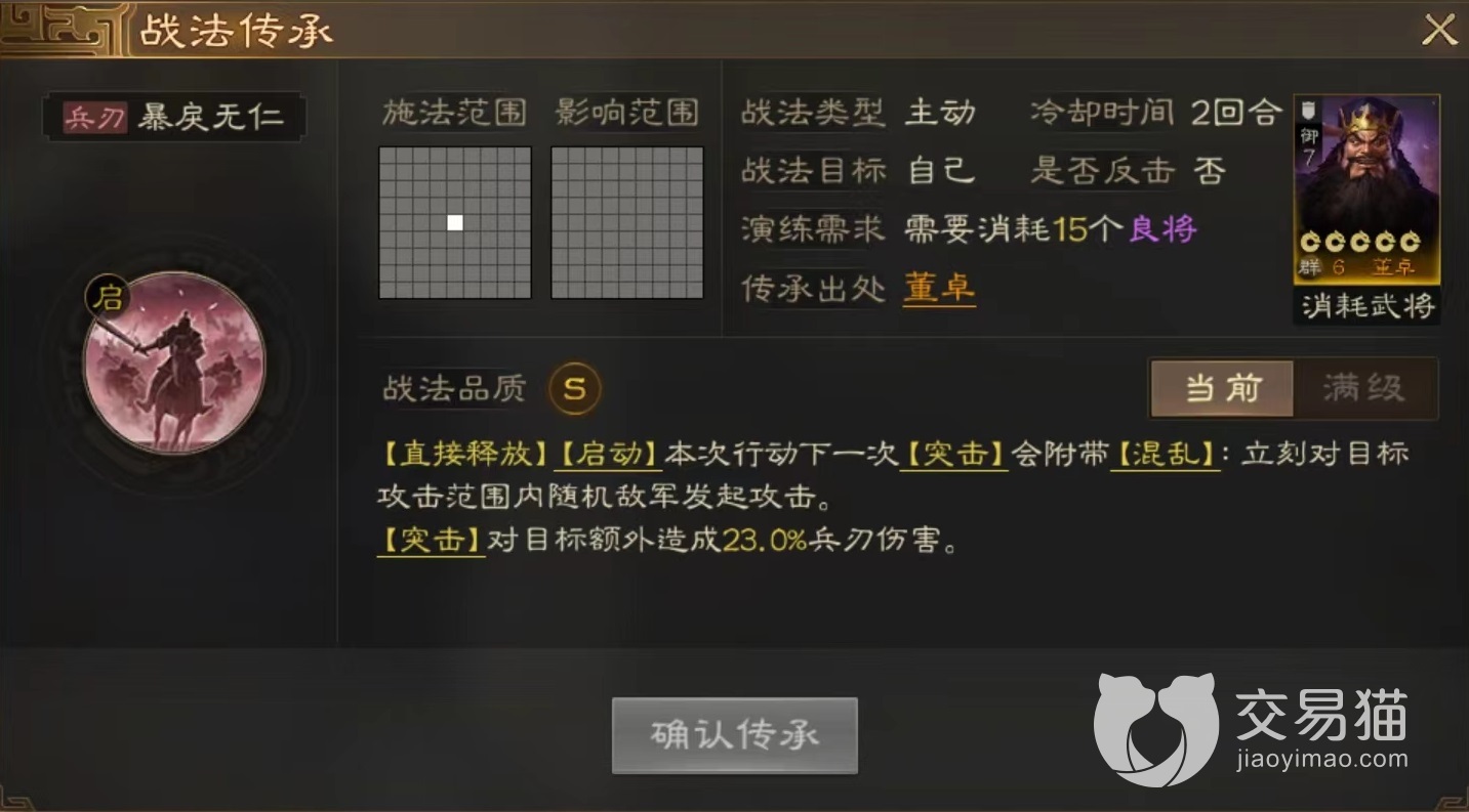 目前最出色的有暴戾无仁、裸衣血战、勇者得前、一言不发这四个。它们都属于橙色品质,而且在获取方面都需要通过对应橙将传承之后获得。暴戾无仁是董卓分解之后获取,效果在启动之后本次行动下一次突击造成伤害的时候会附带混乱状态,混乱之后的敌人无视敌我区别,会随机选定目标造成输出。比直接将其控制住还要好用。很多带有控制型技能的武将纷纷选择携带,这样强化整体效果。