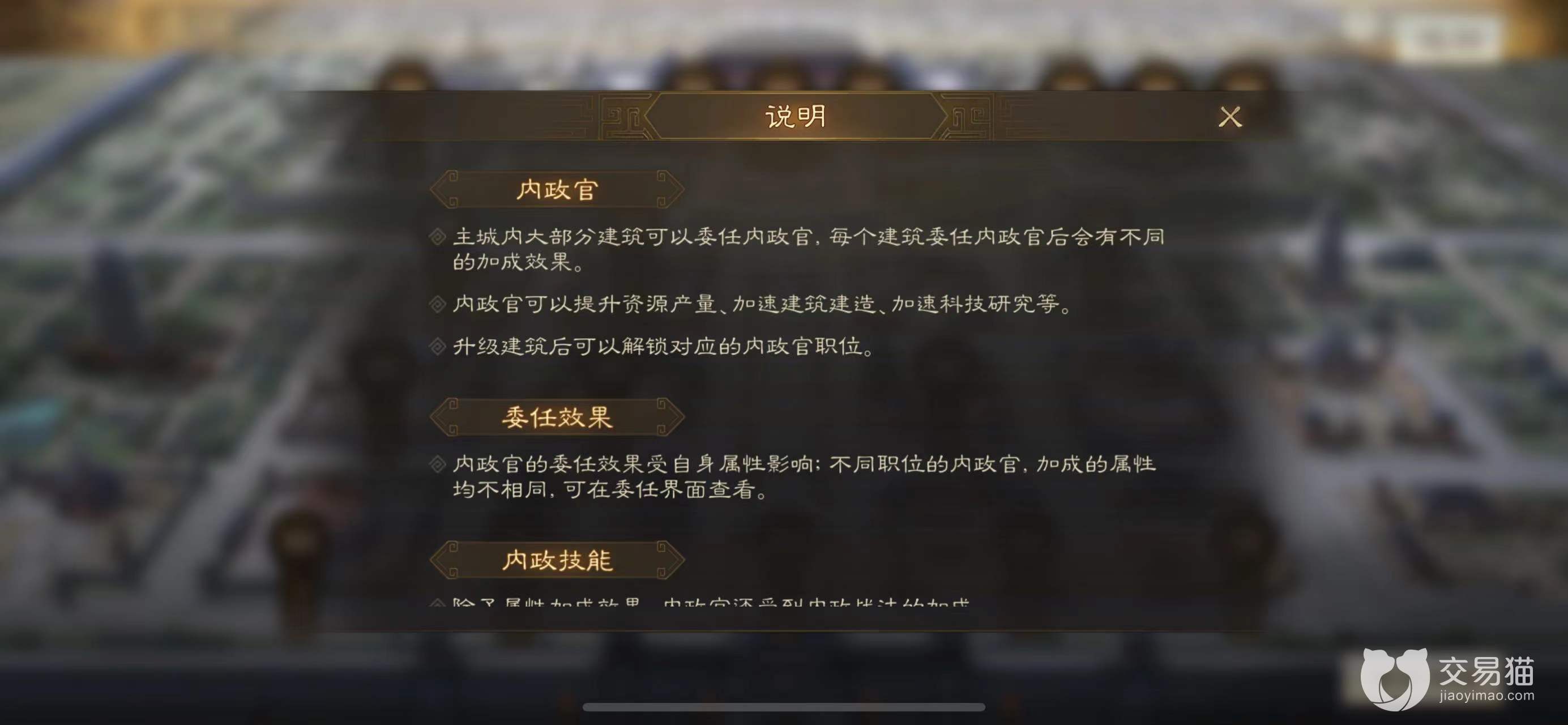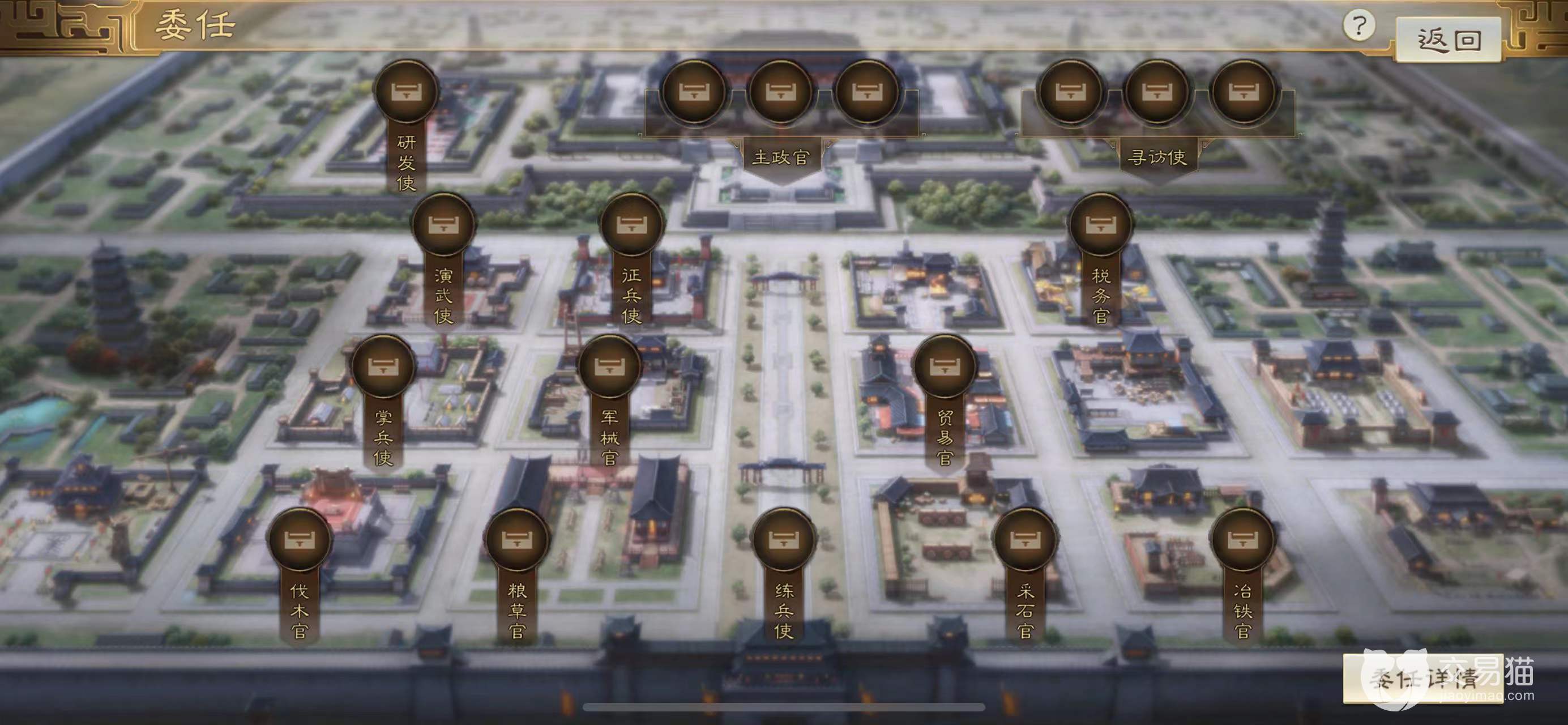 你可以将拥有超高魅力值的人委任为各种官员,第一步需要来到政厅那里,进去之后便可看到各种职位。内政官可加快科技成果的研发以及城市的建造速度,然后你可以根据武将自身的魅力属性与技能去获得不同程度的加成效果。