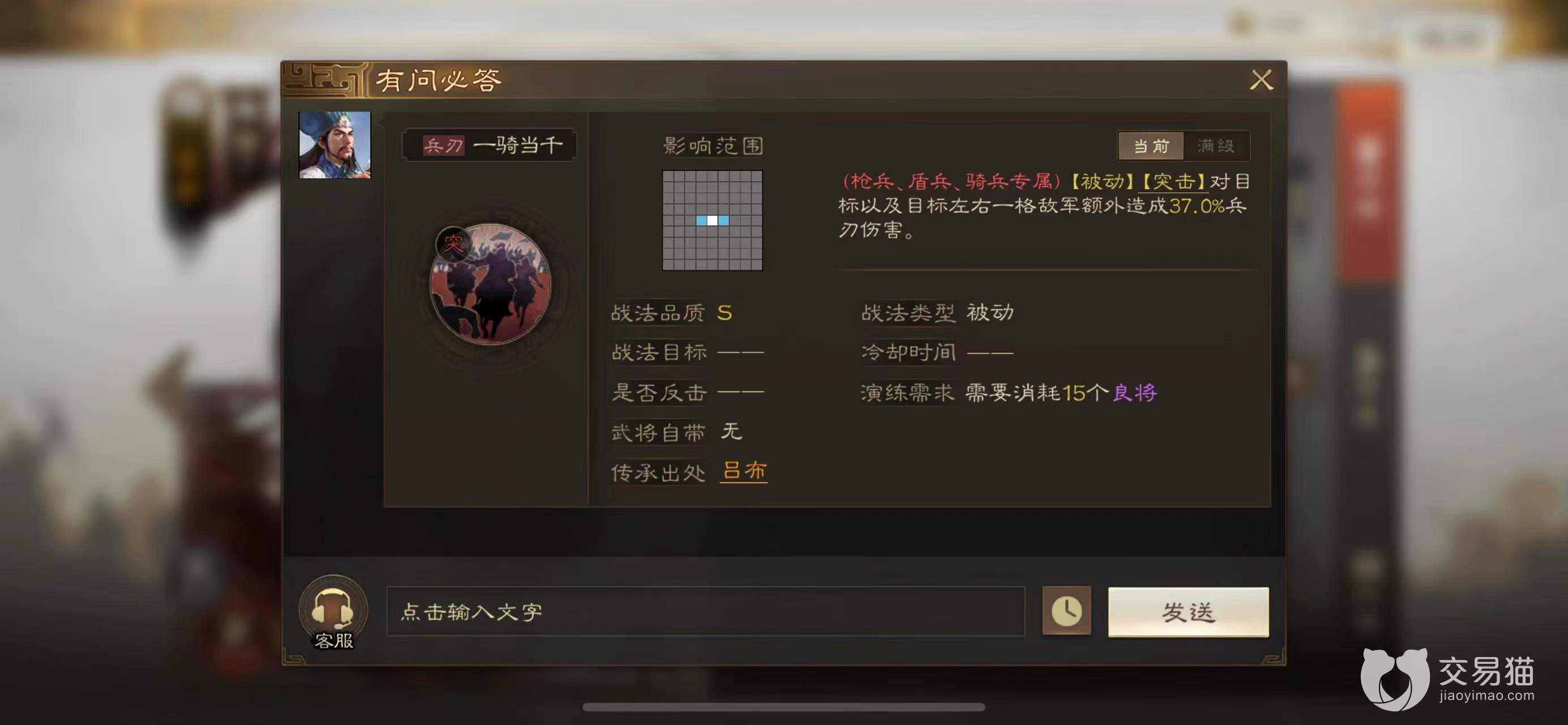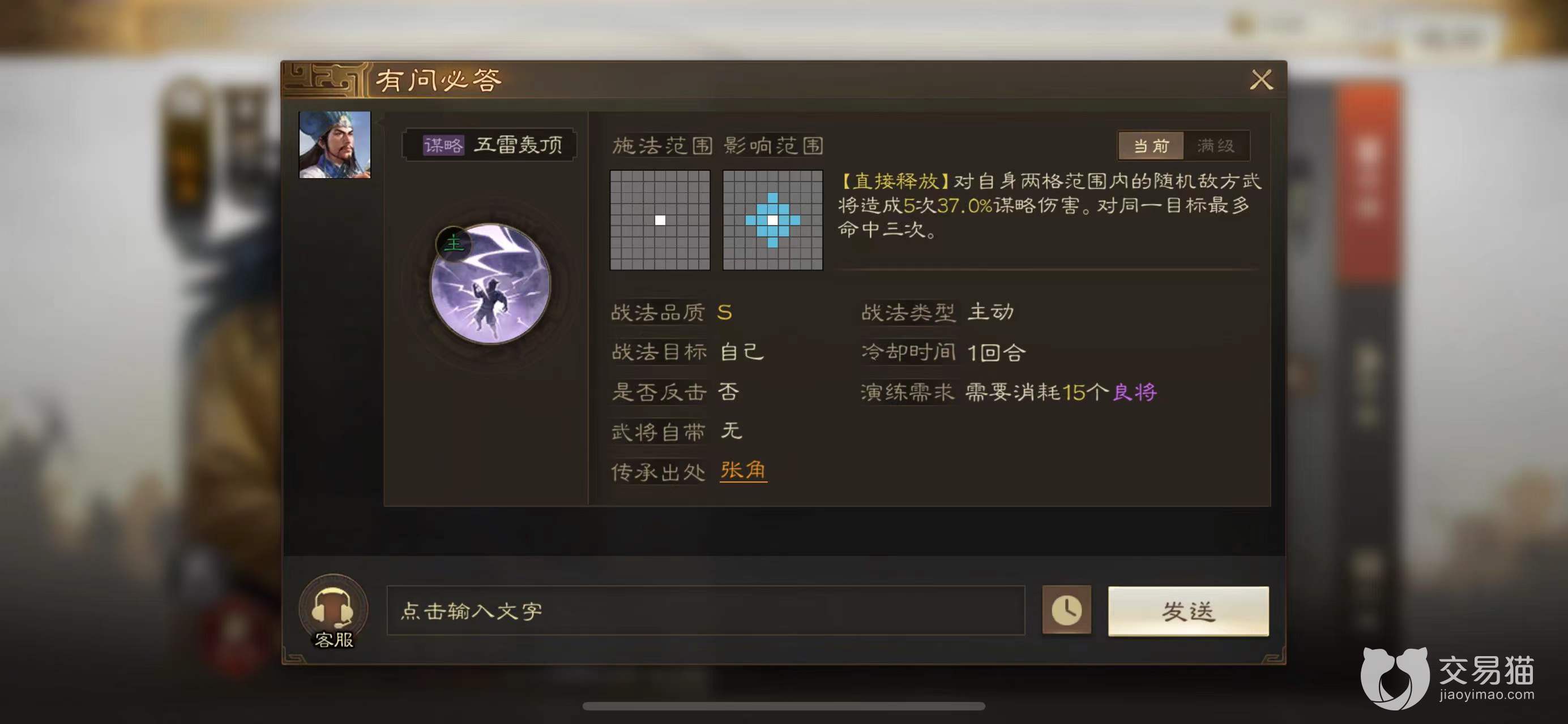 若是对手的防御值比较强的话,则还需要带上谋略战法。这里选择五雷轰顶就很好,因为该技能可以对范围内的敌人造成随机输出,甚至可连续攻击高达三次。能够令他瞬间便歼灭对手,而且还是S级品质的技能,拥有更强的可塑性。