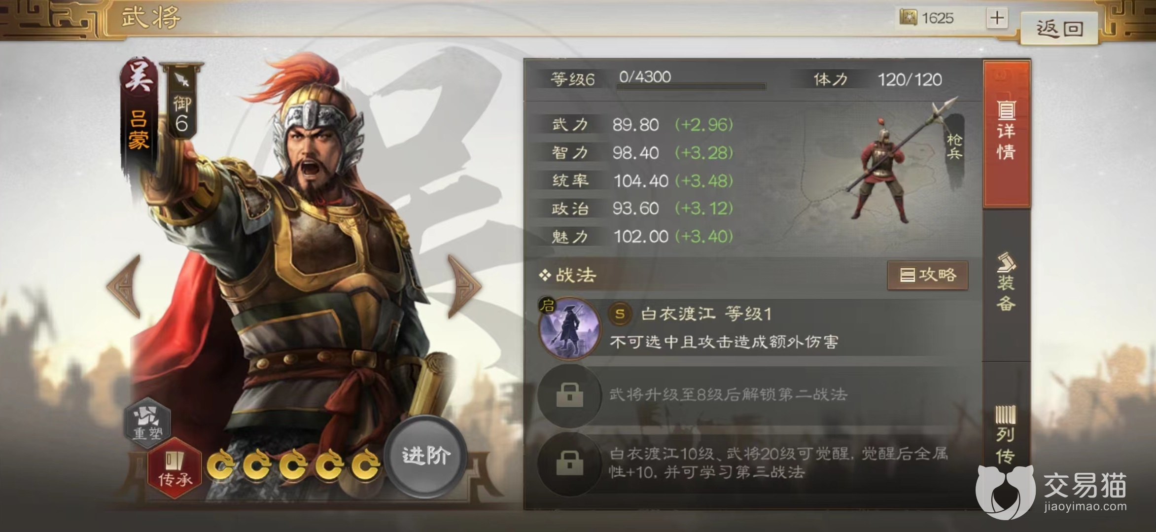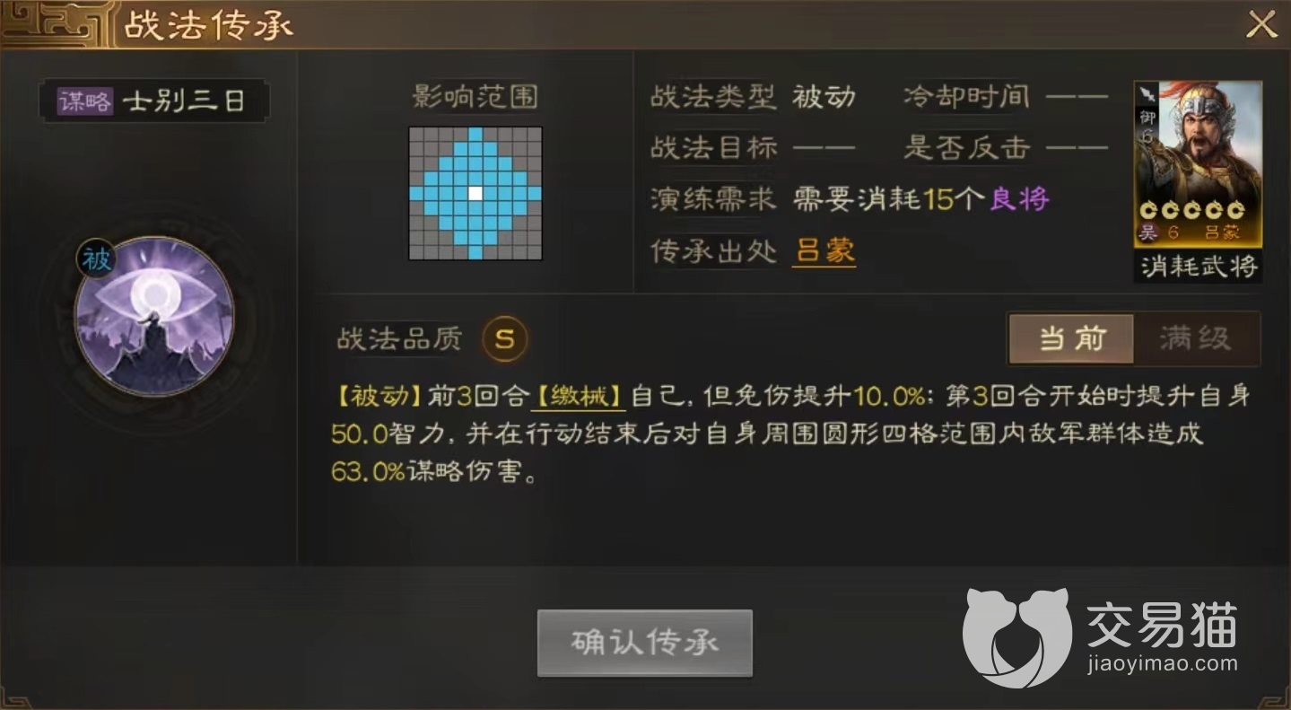 从该看法名称就能看出,肯定是和吕蒙相关,事实上确实如此,需要玩家将吕蒙整卡分解传承掉之后才能获得。而吕蒙本身又是东吴阵营中不可缺少一员,所以获得该战法要付出很大牺牲,最适合玩家就是不打算走东吴阵营路线,或者是走火烧队,此时吕蒙就不再是必选项,这样就可以将其安心分解掉。