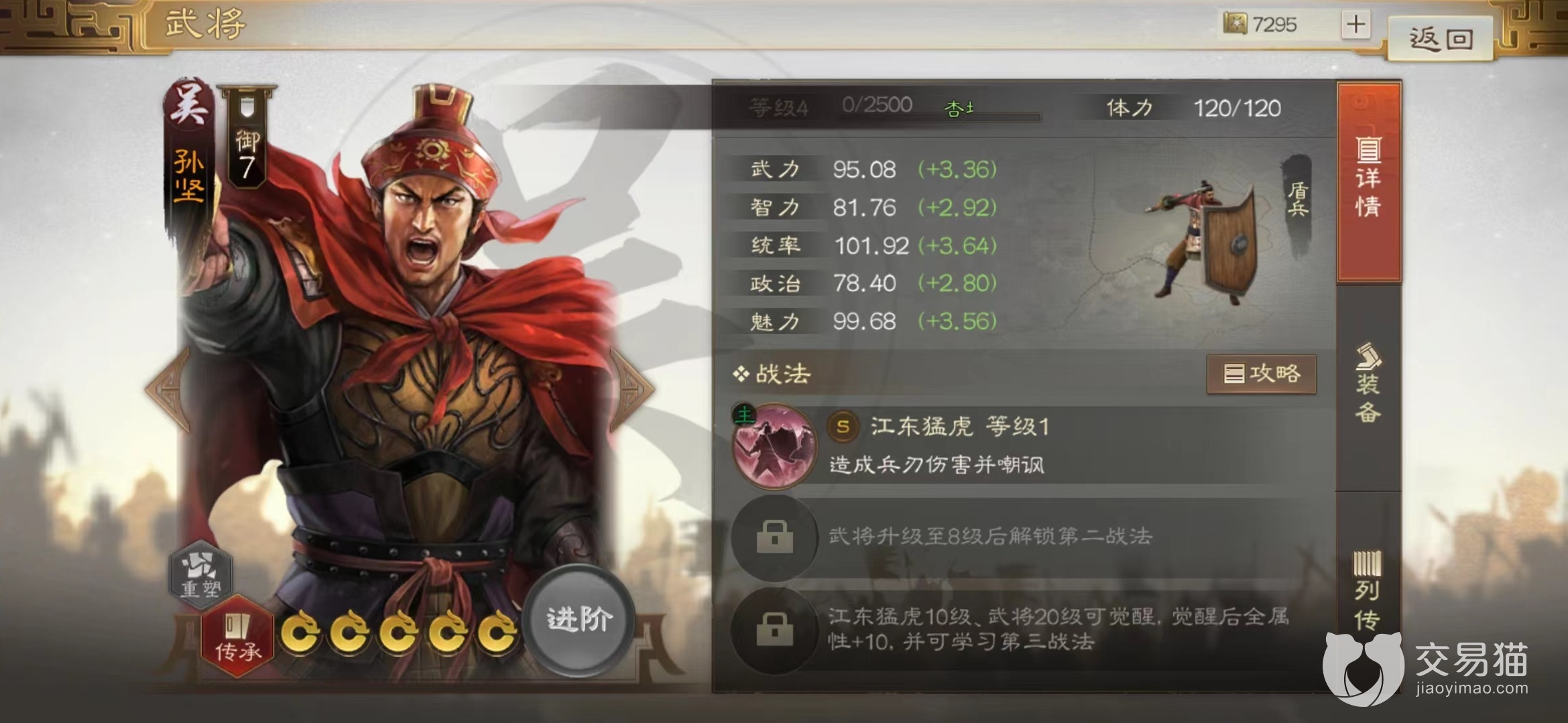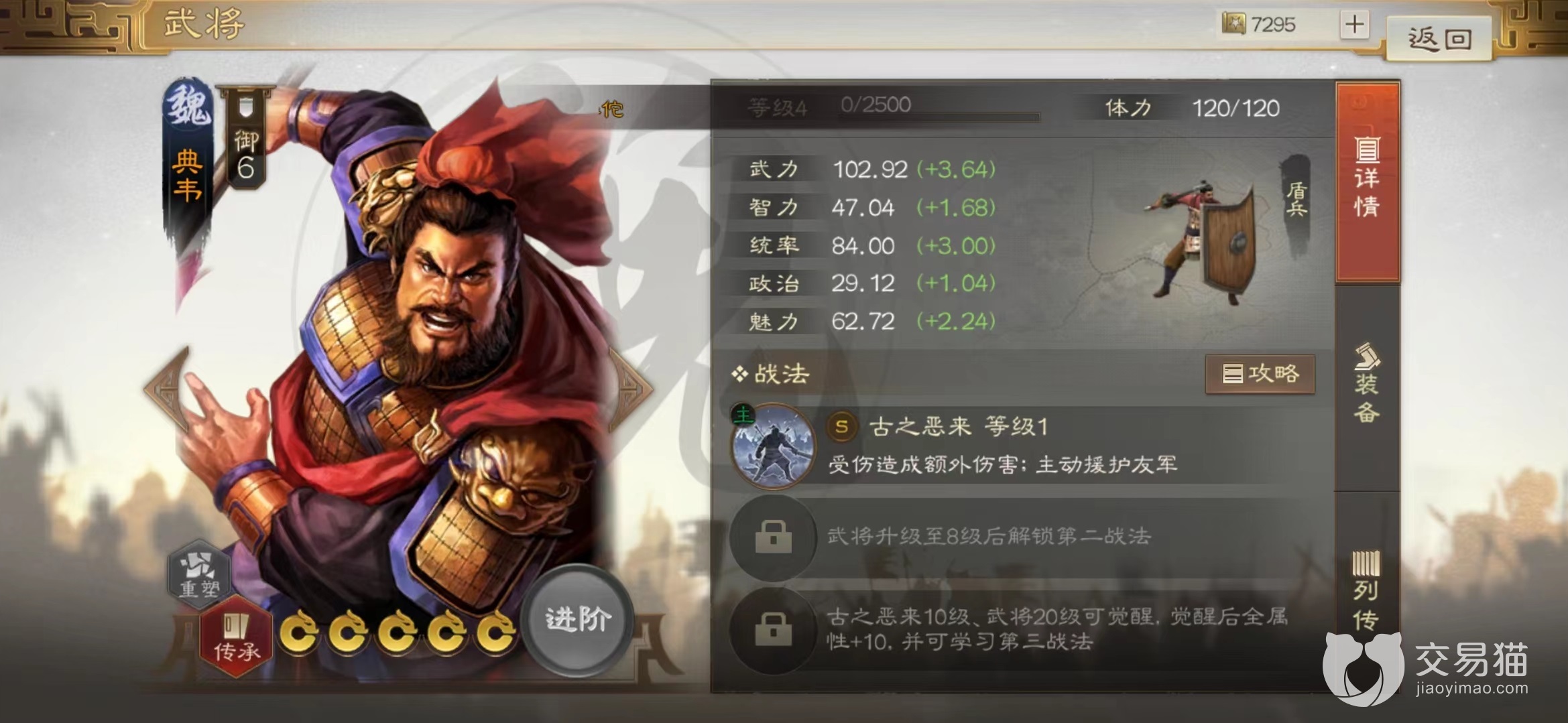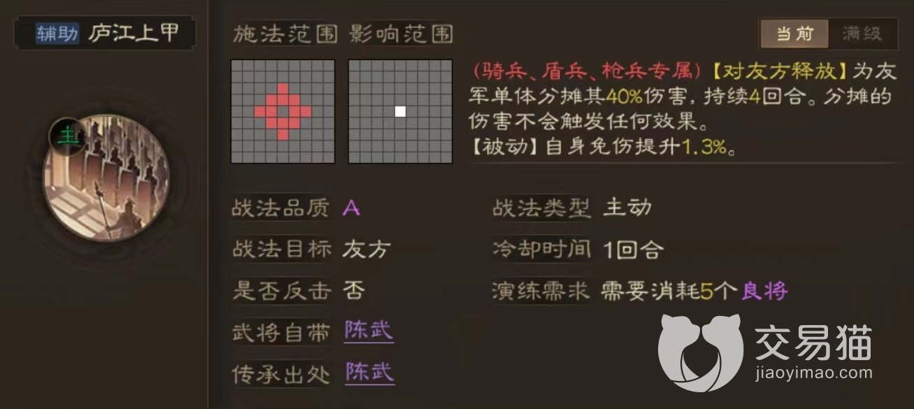 这是一款a级品质的战法,属于主动释放类型,在使用之后进入到一回合冷却时间,而且只有骑兵,枪兵和盾兵,武将才能使用。要想获得需要先得到武将陈武,然后在传承功能中分解掉就能获取。效果是使用之后选定友军目标释放,可以为其分摊受到的伤害,分摊过程持续4个回合。