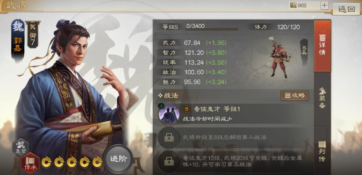 如果你比较喜欢法师类型的武将的话,选择郭嘉无疑是一种很好的选择。他属于魏国的橙卡,拥有着超高的智力以及统帅值,可以迅速地统御大量弓兵,进行远程射击非常给力。另外他的技能才是他的核心玩法,可以不断地减少战法冷却时间,减少一个回合。所以不管是佩带控制技能还是辅助技能,都可以搭配他的输出技能,轻松打出爆炸输出,还能避免被敌人秒掉。