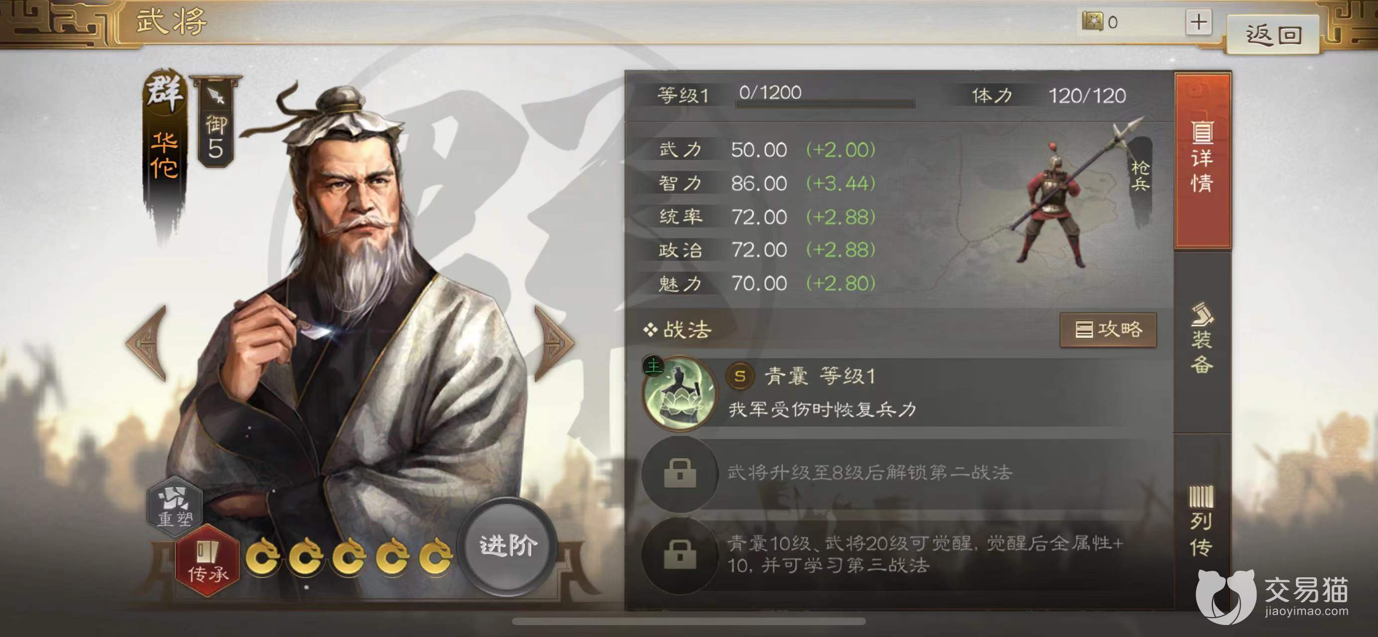 若是你更加喜欢安逸一点的打法的话,则可以选择这个强力的奶爸辅助—华佗。毕竟主C会随着版本的更替慢慢变弱,辅助却不管在哪个阵容里面都有一席之地。华佗的智力值很高,能够稳定地给一个队友进行治疗,避免你的主C给人秒掉。另外还可以给军队里的其他士兵进行群奶,施加一个群奶buff,并且没有回合限制,而且他还能降低枪兵受到的伤害。