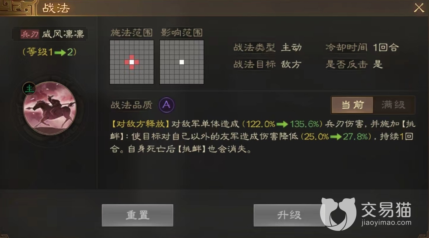 该技能属于非常适合进攻型肉盾选择的技能,因为挑衅之后相当于以自身为代价拯救了其他友军,会承受比较多的输出,而且此技能满级后伤害比例非常高,也具有相当程度的输出能力。如果给橙将使用,那么小编推荐孙坚、典韦、孙策等。孙坚自然非常合适,因为本身战法江东猛虎就是拥有这样效果的技能,同样包括单体伤害和附加嘲讽,只不过增添了被动免伤效果,这样可以和威风凛凛交替使用,始终保持嘲讽状态。