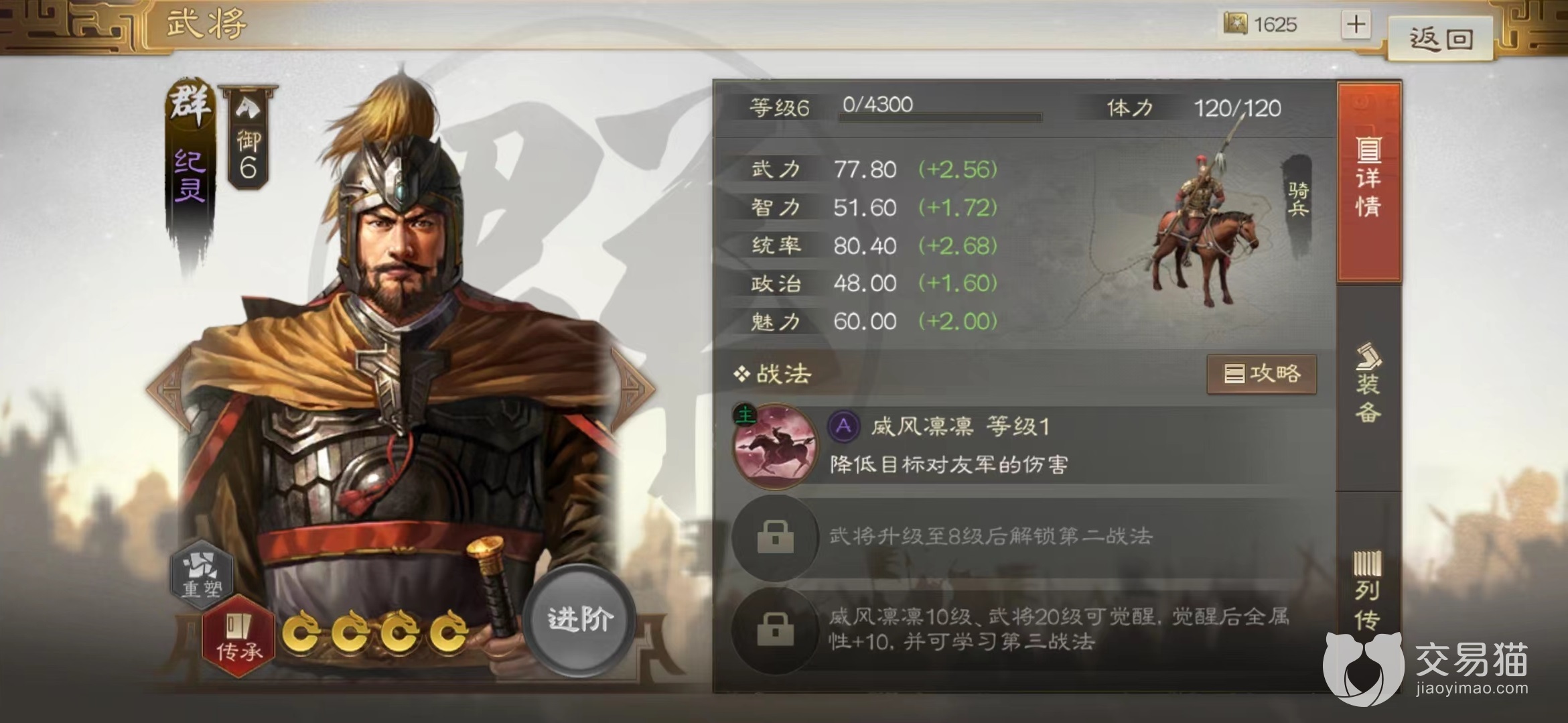 这项战法来自于紫色武将纪灵,相信玩家对这个名字不会陌生,在三国演义前期也是一员虎将,虽然被归到紫色的类型,但是是开荒时,很多玩家经常用的角色。当不需要纪灵发挥作用之后就可以将其分解掉得到威风凛凛。战法效果是选中敌方单体之后造成兵刃伤害,并且附加挑衅效果。挑衅作用是如果目标攻击除施法者之外其他目标,则造成伤害降低,最多持续一回合。
