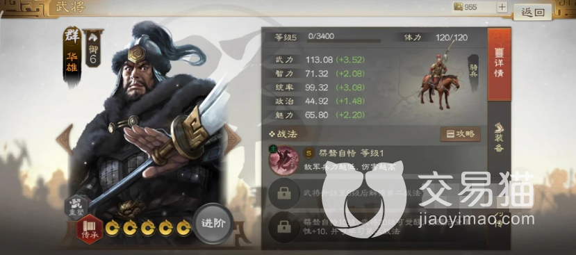 小编推荐是华雄+郭淮+陈武+曹休+纪灵这个阵容,其中的华雄就不比多说了,是咱们的主角,这个阵容也是跟他的名字相关,他的先天战法是桀骜自恃,这个战法是一个单体伤害比较高的战法,对面的人越少,造成的伤害越高。