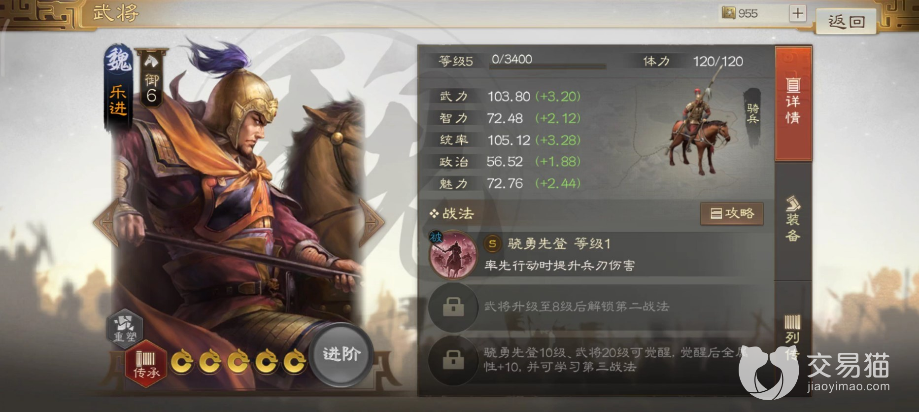 勇者得前在游戏中属于传承战法,带这个战法的将领是魏国的乐进,也就是说大家可以将这个战法拆了之后放在别的将领身上使用,而这个战法还有个特殊之处在于它是启动战法,意思就是装备这个战法的武将在回合开始就可以使用它,之后还能正常攻击和行动,并不占用回合数,相当强力。