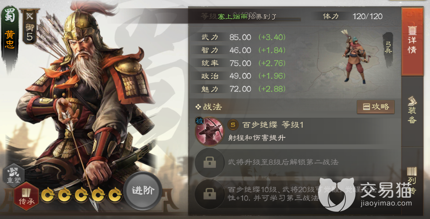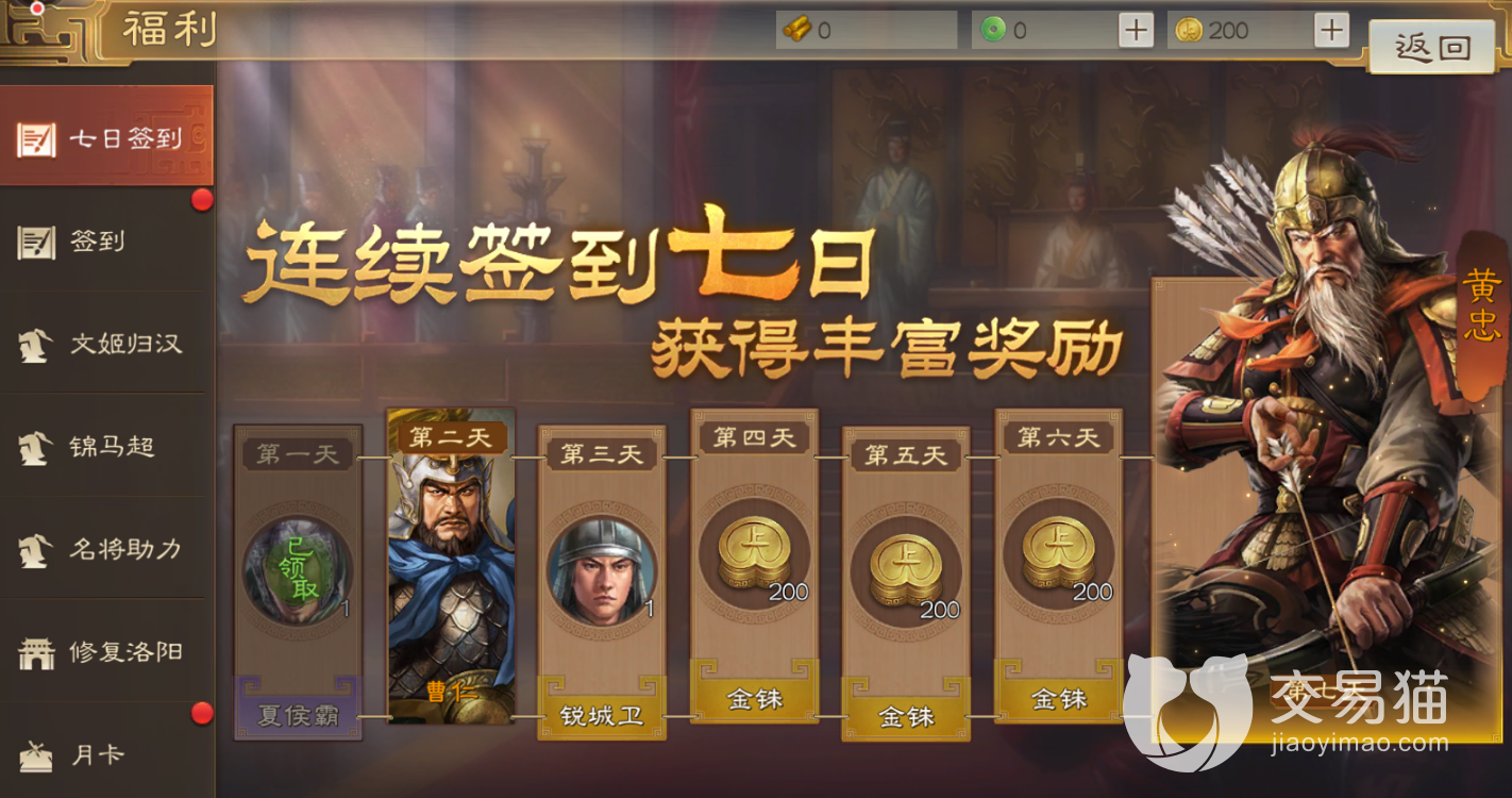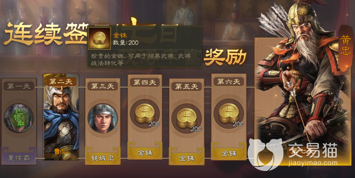 第七天:蜀国武将黄忠,这个角色也是五星,子阿属性上要比前面送的武将都好,而且是一个弓兵。