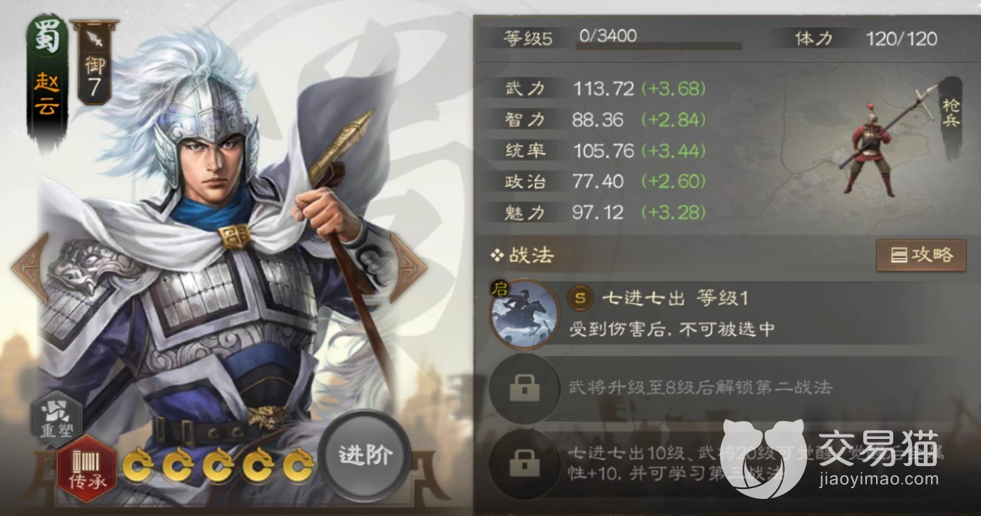 属性:在武力上赵云是远强于陆逊的,不过后者因为走的是谋略路线,所以2.36的成长数值决定了他的普攻也不会太弱。智力上赵云就被完全碾压了,陆逊3.64的成长数值放眼整个游戏也是排在前列的。统率的话陆逊也比赵云略高,而且因为兵种是枪,实战过程中的承伤能力差异会被拉的更大。至于政治与魅力这两个是用于内政的,不多做讨论。总之结合直接影响战斗的三项属性来看,陆逊是小胜赵云的。