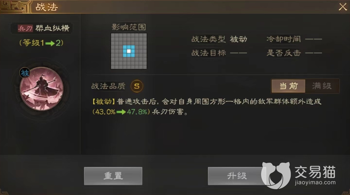 这是一个兵刃输出型突击战法,没有冷却时间限制,突击优势相信大家已经很清楚,那就是在回合中不会占用主动出手机会,效果是当触发突击之后,可以对选定目标以及其左右两边敌军额外造成兵刃伤害。需要尽量选择最佳攻击位置,能够伤害到数量更多敌人,如果能打满三个目标,单单是此战法附加的突击伤害就已经非常恐怖。