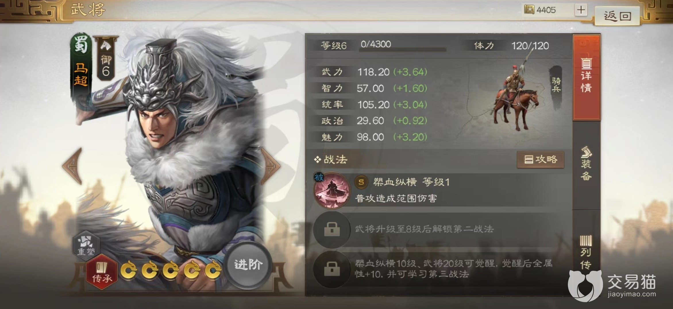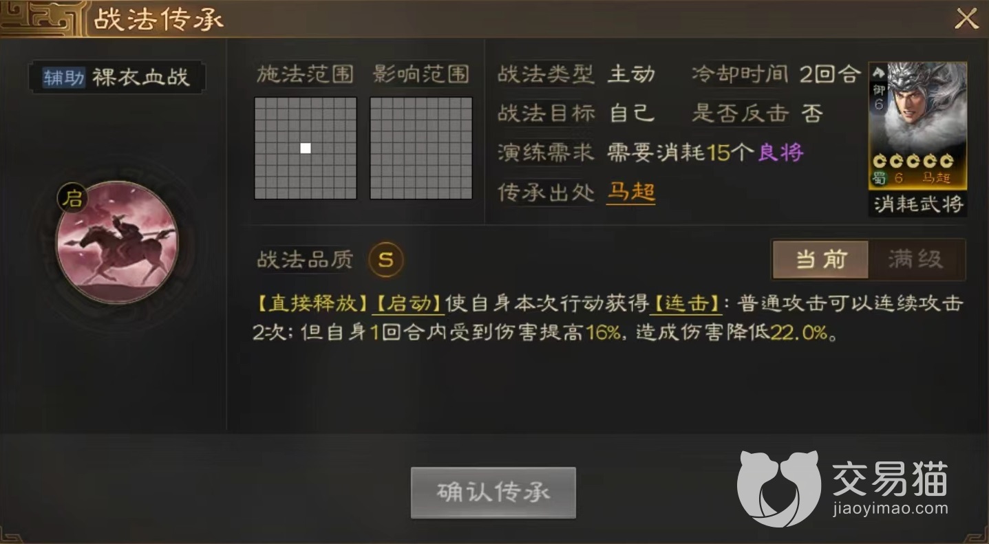 先来讲一下该战法应该如何获取,先获得马超之后将其分解掉,才能通过传承获得。传承过程中也需要消耗大量紫卡,这些都要提前准备好、马超的获取其实并不难,通过少量充值就能直接赠送,但是前期开荒非常关键,将其直接牺牲掉比较可惜,建议等到开荒结束有了其他主力成员之后再分解掉。获取之后的战法效果为启动类型,本次行动获得连击状态,普通攻击能连续攻击两次。