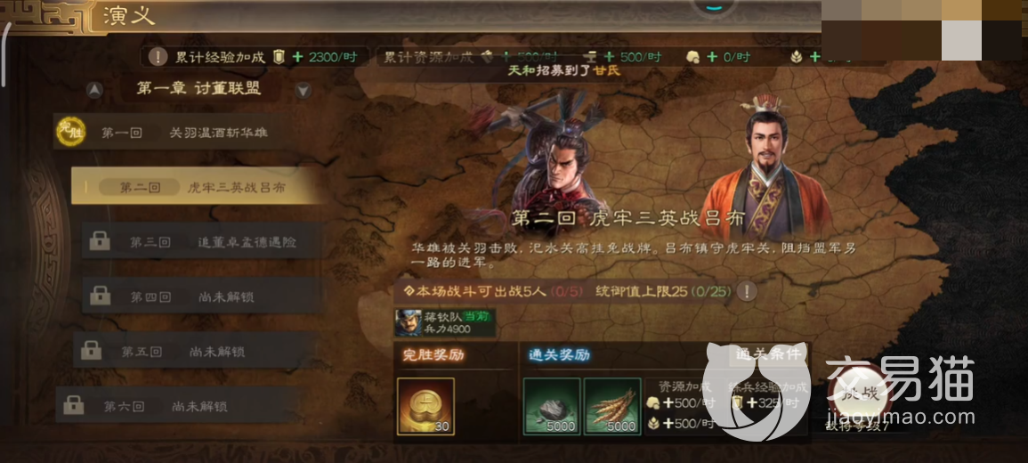 第二关是我们熟知的“三英战吕布”,这也是《三国演义》里的高潮段落之一了,刘关张三人鏖战吕布至今也为人津津乐道。可以看到,通关后的奖励还是非常丰富的,有资源也有金铢。但是这一关难度可不小,是需要一定策略的。
