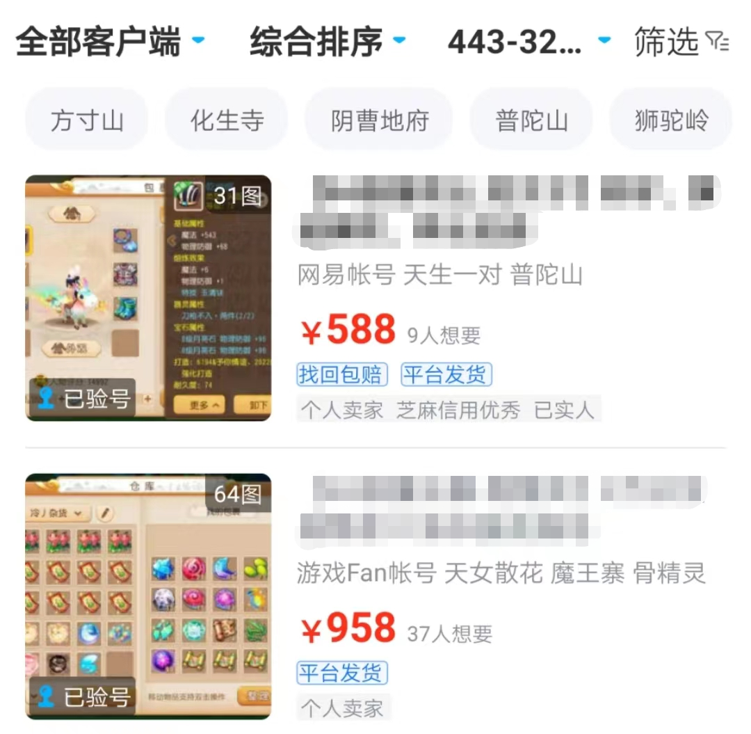 账号情况不一样,出售的价格也不一样,大家只要搜索平台里正在出售的梦幻西游账号,就大概知道自己的账号在什么价格范围内了。它里面的梦幻西游账号价格都是很实在的,除了满修空号以外平台里还有很多其他的账号,比如跑环号或者是宠物号,大家找到那些跟自己账号相同的商品,对比就能得到价格。