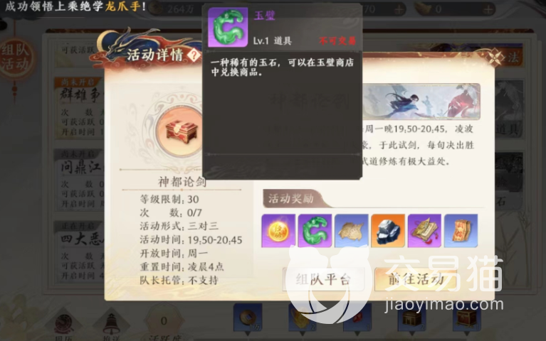 玉璧目前之游戏中一个中比较重要的玉璧,获取的方式相比其他的货币来说也是比较单一的,最常用的方式其实就是参与深度论剑,这个活动是一个三人组队才可以参与的活动,而且是在每周一晚才可以开始报名参与,所以就靠这一个活动获取的玉璧可能需要囤好久才够用。