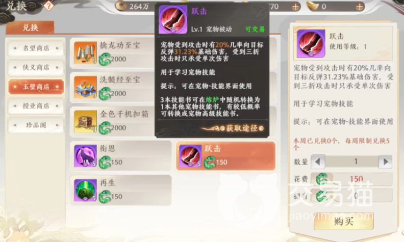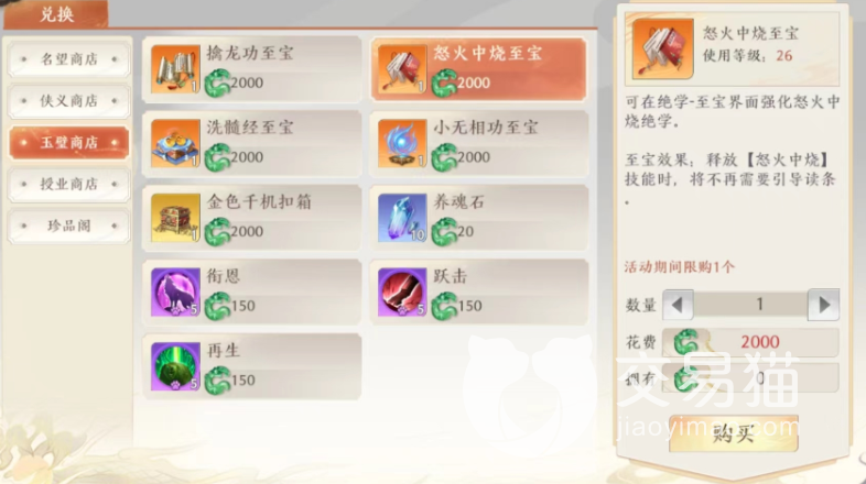不管大家想兑换什么都可以在商店中看到所需的玉璧价格,大家要是不想充值的话,其实是可以参与神都论剑,然后慢慢囤积一些玉璧,反正商店中的绝学是不会属性的,大家无论什么时候集齐都可以随时去兑换哦。