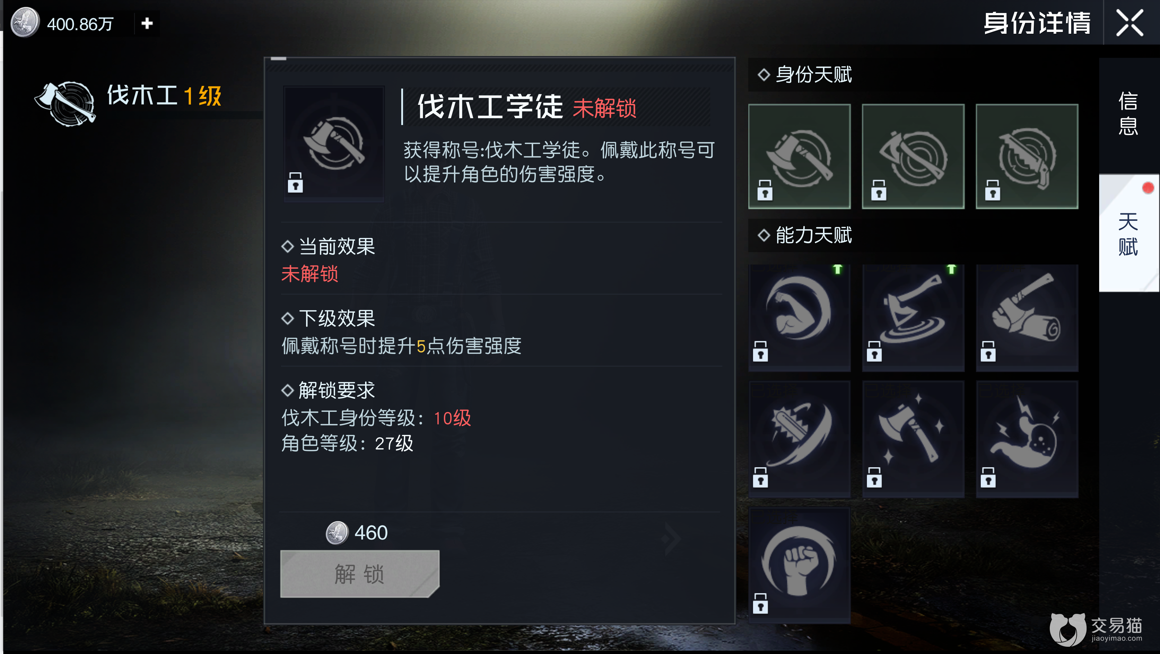 就像此处的伐木工想要达到学徒这个级别,就需要将这个身份的等级提升至十级,同时角色本身的等级要提升至二十七级,这样才能获取到这个学徒的称号,同时角色的伤害会得到一定数额的提升。