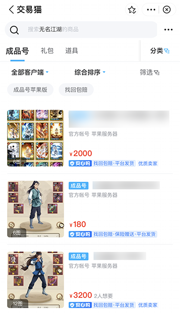 平台无名江湖账号曝光量高。交易猫作为大型游戏交易平台,它活跃用户数为几亿。无名江湖账号发布之后,海量买家看见,通过搜索和条件筛选寻找账号太轻松。