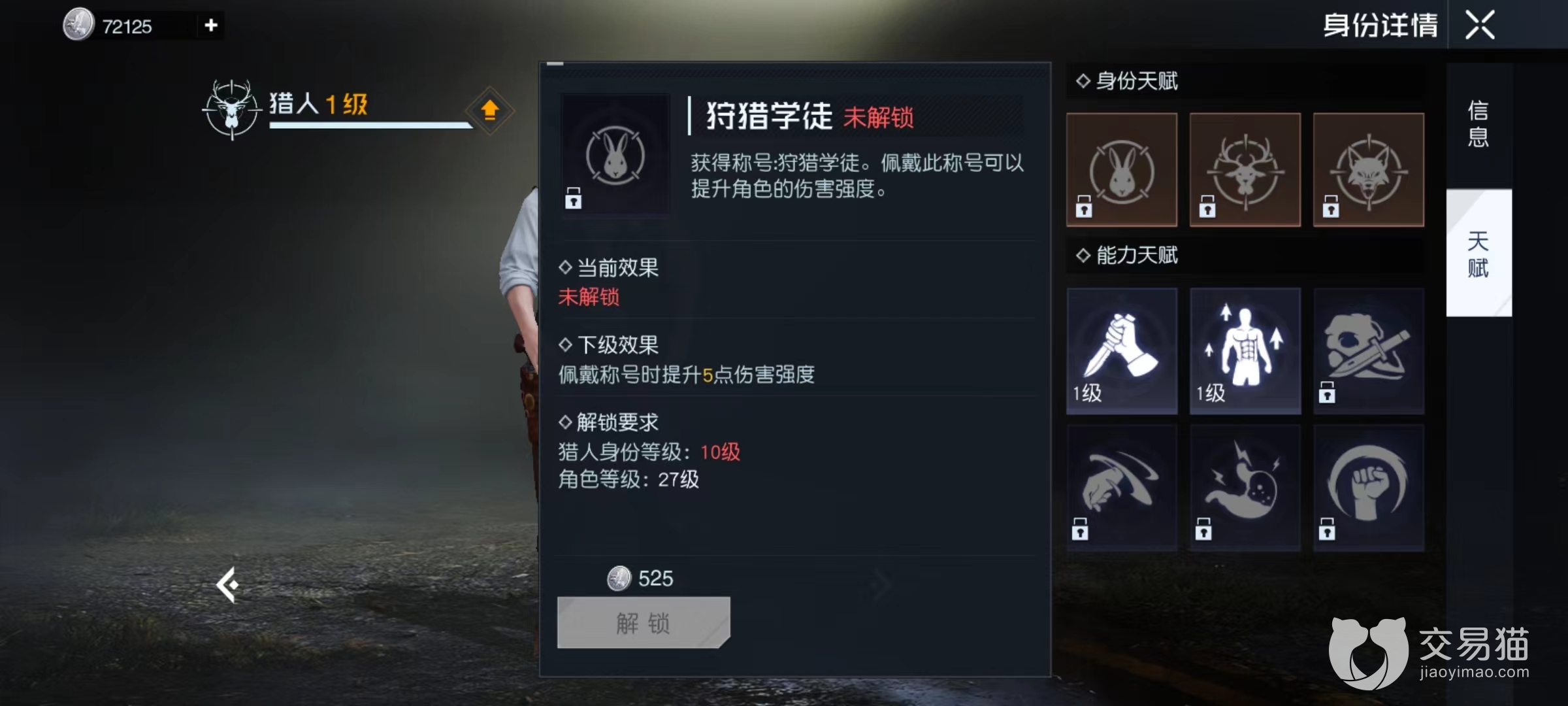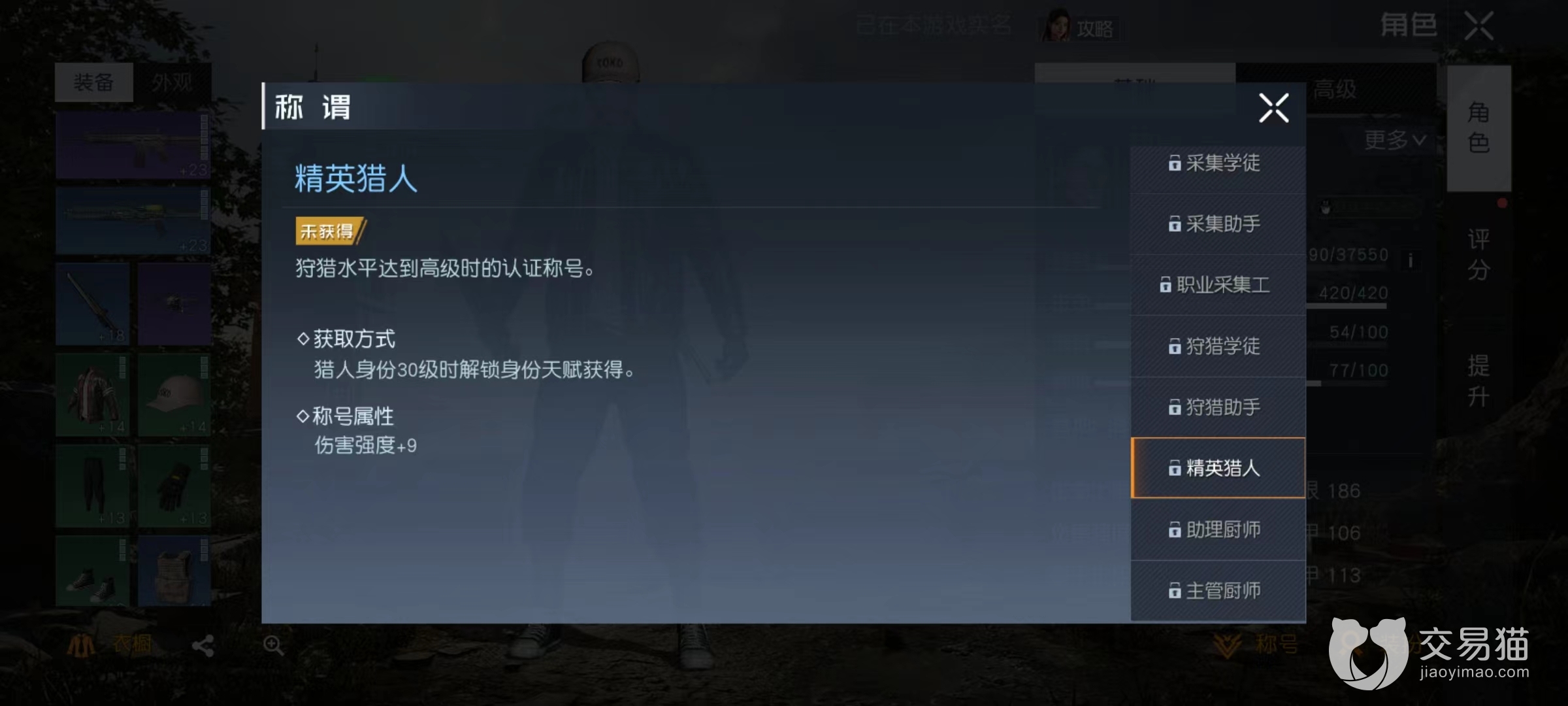 可以先将采集工的熟练度升级到15级,将体能锻炼这一技能升到3级之后,小伙伴们再去升级“猎人”这一职业,可以获得重伤抵抗的能力,并且能够相对应的提高对应资源的掉落率以及提高狩猎的速度、降低狩猎时的饱食度消耗等,升级到10级之后,还能够获得“狩猎学徒”的称号,能够提高小伙伴们5点伤害强度,是一个相当可观的提升。