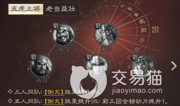 五虎阵容对抗玩家会有奇效,虽然整体御值超高,但考虑到每个人都能打伤害,所以往往能形成一波流的局面,而且需要注意的是他们还能凑出专属的羁绊,无论是武力的增益,还是倒戈的加持,都无疑能让他们更好且更长久的进行持续输出。
