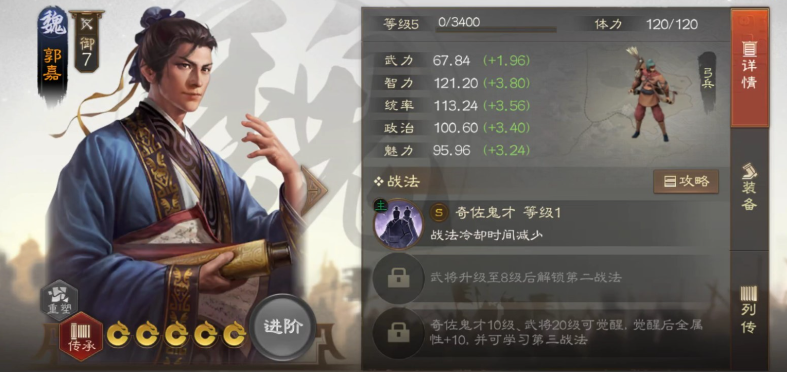 如果对面有奉孝这个角色的话,建议大家可以搭配一个诱敌深入的战法,跟郭嘉对过的玩家都知道,这个角色很阴,老是打不到人,使用这个战法可以让大家集火先把奉孝击杀,不然他一直在场上会影响到状态,但是这个战法也要看是哪些角色来使用。