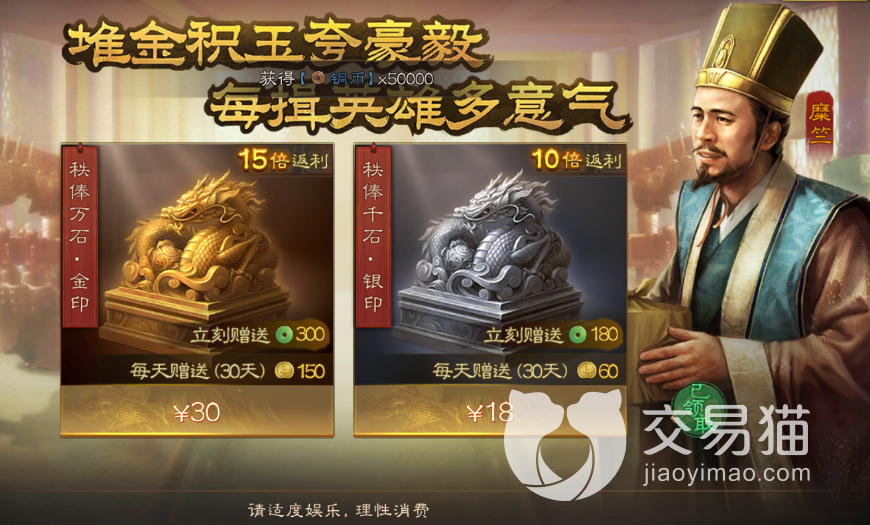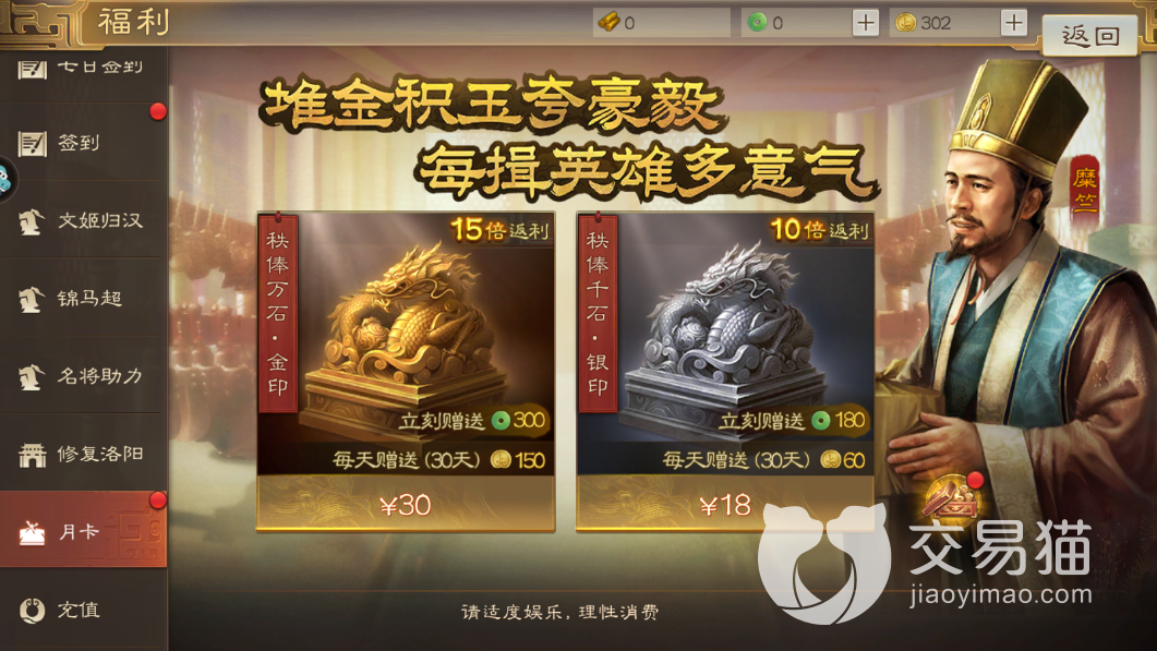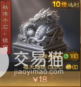 第二个月卡就是一个银印,这个月卡花费18元就可以获取,不过在返利上面没有金印高,只有十倍的返利,可以获取的玉璧是充值差不多180个,然后是月卡有效期中每天都可以领取到30个金铢。