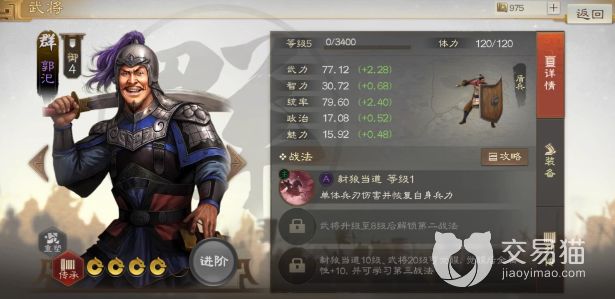 所以这个战法其实是一个适合培养过后再使用的战法,前期的伤害是118%的兵刃伤害在加上30%的治愈率,这个百分比其实在前期也是够了的,大家要是想传承过来的话,就赶紧去游戏中抽取到郭汜这个武将吧。